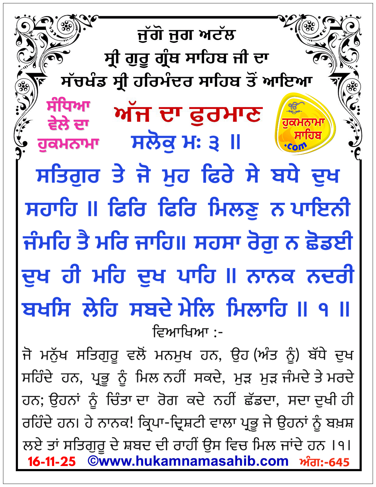 Sandhia Vele Da Hukamnama Sri Darbar Sahib, Amritsar, Date 16-11-2025 Ang 645