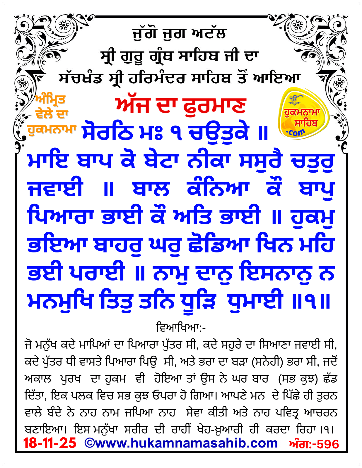 Amrit Vele da Hukamnama Sri Darbar Sahib, Amritsar Sahib, Ang 596, 18-11-25