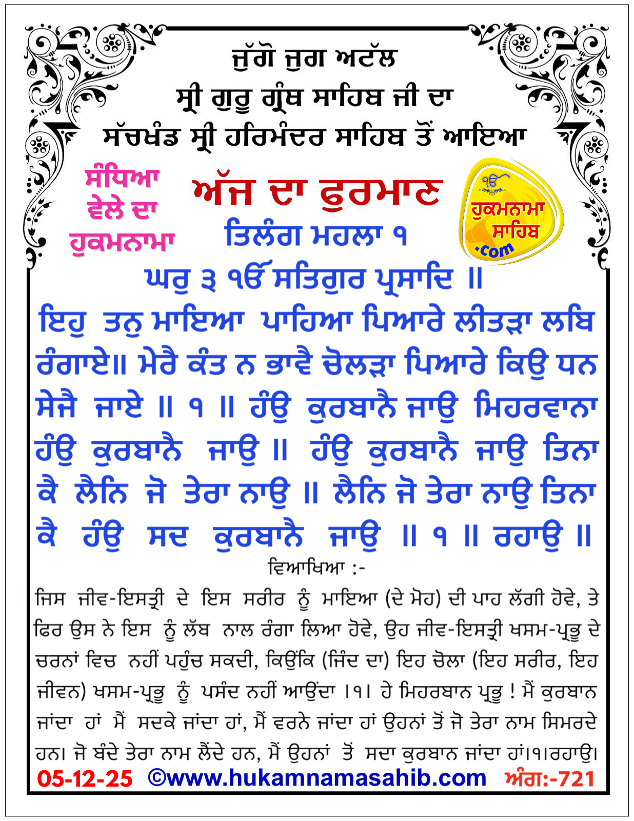 Meaning: Tilang Mahalaa 1 Ghar 3 One Universal Creator God. By The Grace Of The True Guru: This body fabric is conditioned by Maya, O beloved; this cloth is dyed in greed. My Husband Lord is not pleased by these clothes, O Beloved; how can the soul-bride go to His bed? ||1|| I am a sacrifice, O Dear Merciful Lord; I am a sacrifice to You. I am a sacrifice to those who take to Your Name. Unto those who take to Your Name, I am forever a sacrifice. ||1|| Pause || If the body becomes the dyer’s vat, O Beloved, and the Name is placed within it as the dye, and if the Dyer who dyes this cloth is the Lord Master – O, such a color has never been seen before! ||2|| Those whose shawls are so dyed, O Beloved, their Husband Lord is always with them. Bless me with the dust of those humble beings, O Dear Lord. Says Nanak, this is my prayer. ||3|| He Himself creates, and He Himself imbues us. He Himself bestows His Glance of Grace. Nanak Ji, if the soul-bride becomes pleasing to her Husband Lord, He Himself enjoys her. ||4||1||3||