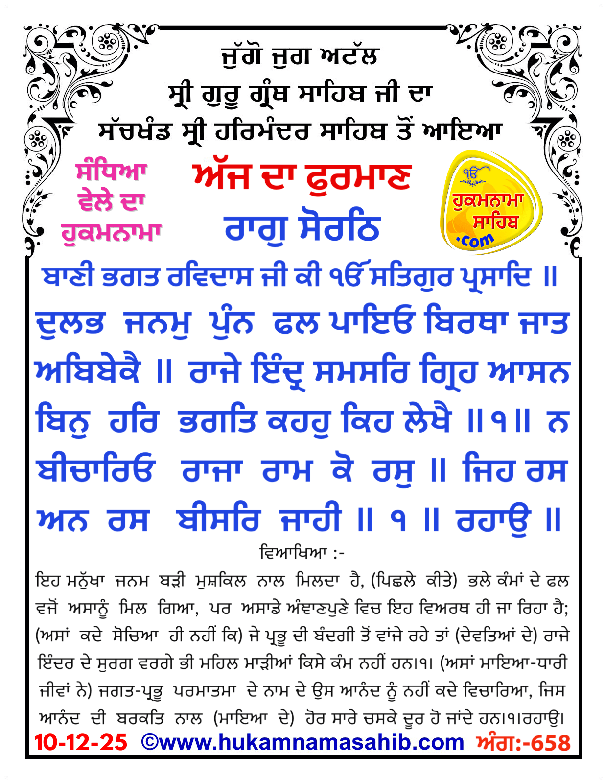 ਰਾਗੁ ਸੋਰਠਿ ਬਾਨੀ ਭਗਤ ਰਵਿਦਾਸ ਜੀ ਕੀ ੴ ਸਤਿਗੁਰ ਪ੍ਰਸਾਦਿ ॥ ਦੁਲਭ ਜਨਮੁ ਪੁੰਨ ਫਲ ਪਾਇਓ ਬਿਰਥਾ ਜਾਤ ਅਬਿਬੇਕੈ ॥ ਰਾਜੇ ਇੰਦ੍ਰ ਸਮਸਰਿ ਗ੍ਰਿਹ ਆਸਨ ਬਿਨੁ ਹਰਿ ਭਗਤਿ ਕਹਹੁ ਕਿਹ ਲੇਖੈ ॥੧॥ ਨ ਬੀਚਾਰਿਓ ਰਾਜਾ ਰਾਮ ਕੋ ਰਸੁ ॥ ਜਿਹ ਰਸ ਅਨ ਰਸ ਬੀਸਰਿ ਜਾਹੀ ॥੧॥ ਰਹਾਉ ॥ ਜਾਨਿ ਅਜਾਨ ਭਏ ਹਮ ਬਾਵਰ ਸੋਚ ਅਸੋਚ ਦਿਵਸ ਜਾਹੀ ॥ ਇੰਦ੍ਰੀ ਸਬਲ ਨਿਬਲ ਬਿਬੇਕ ਬੁਧਿ ਪਰਮਾਰਥ ਪਰਵੇਸ ਨਹੀ ॥੨॥ ਕਹੀਅਤ ਆਨ ਅਚਰੀਅਤ ਅਨ ਕਛੁ ਸਮਝ ਨ ਪਰੈ ਅਪਰ ਮਾਇਆ ॥ ਕਹਿ ਰਵਿਦਾਸ ਉਦਾਸ ਦਾਸ ਮਤਿ ਪਰਹਰਿ ਕੋਪੁ ਕਰਹੁ ਜੀਅ ਦਇਆ ॥੩॥੩॥