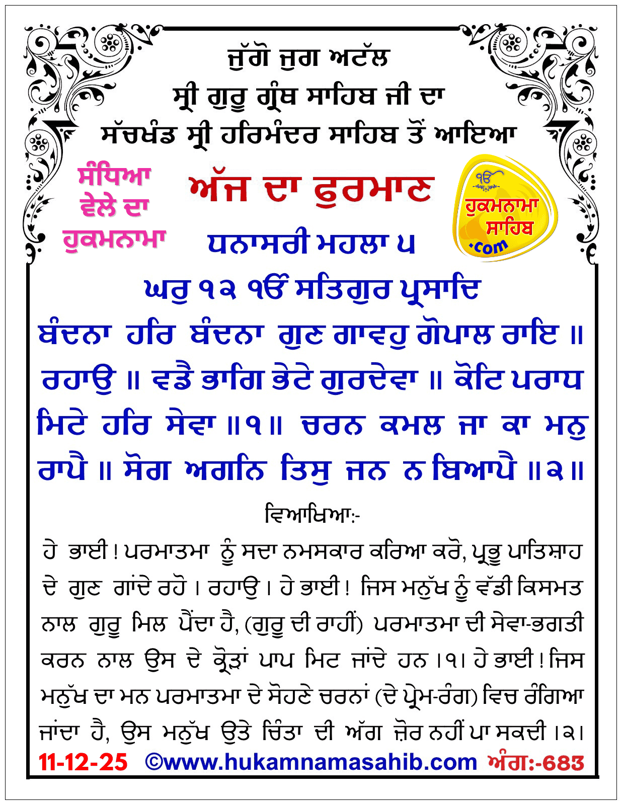 SANDHIYA WELE DA HUKAMNAMA SACHKHAND SRI DARBAR SAHIB AMRITSAR