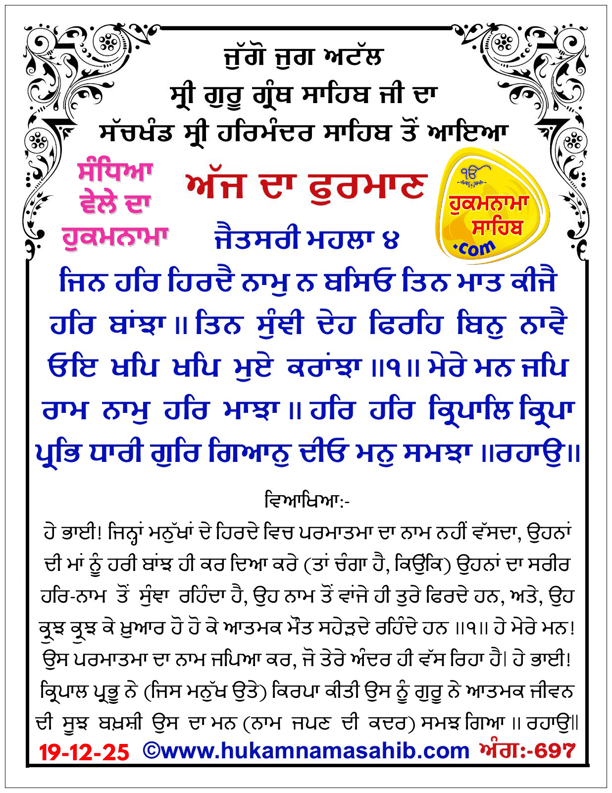 Sandhia Vele Da Hukamnama Sri Darbar Sahib, Amritsar, Date 19-12-2025 Ang 697
