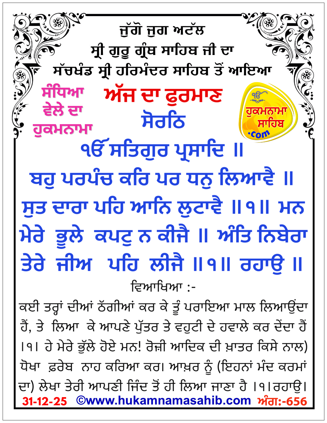 Sandhia Vele Da Hukamnama Sri Darbar Sahib, Amritsar, Date 31-12-2025 Ang 656