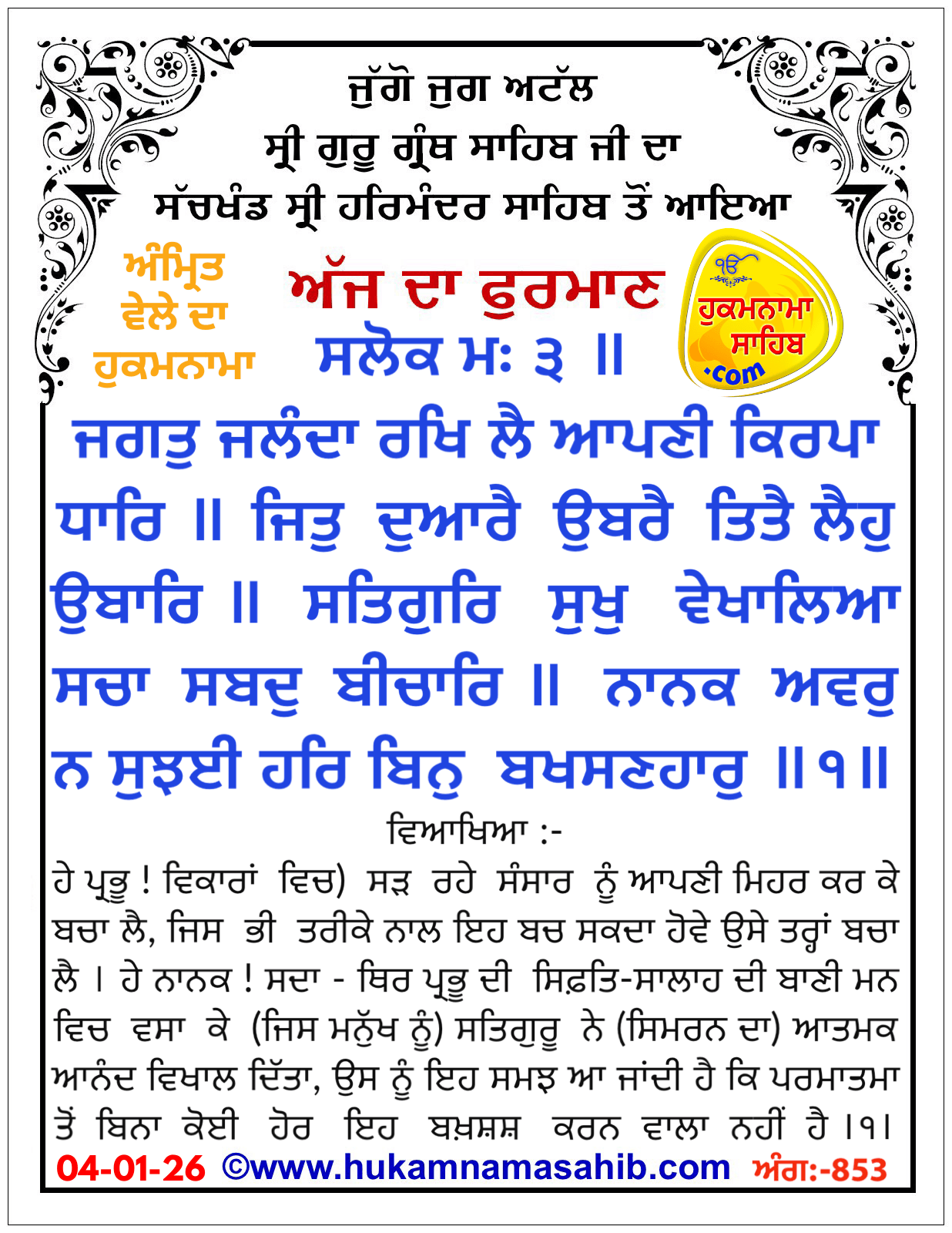 Amrit wele da mukhwakh shri Harmandar sahib amritsar sahib ji, Ang-853, 04-01-2026