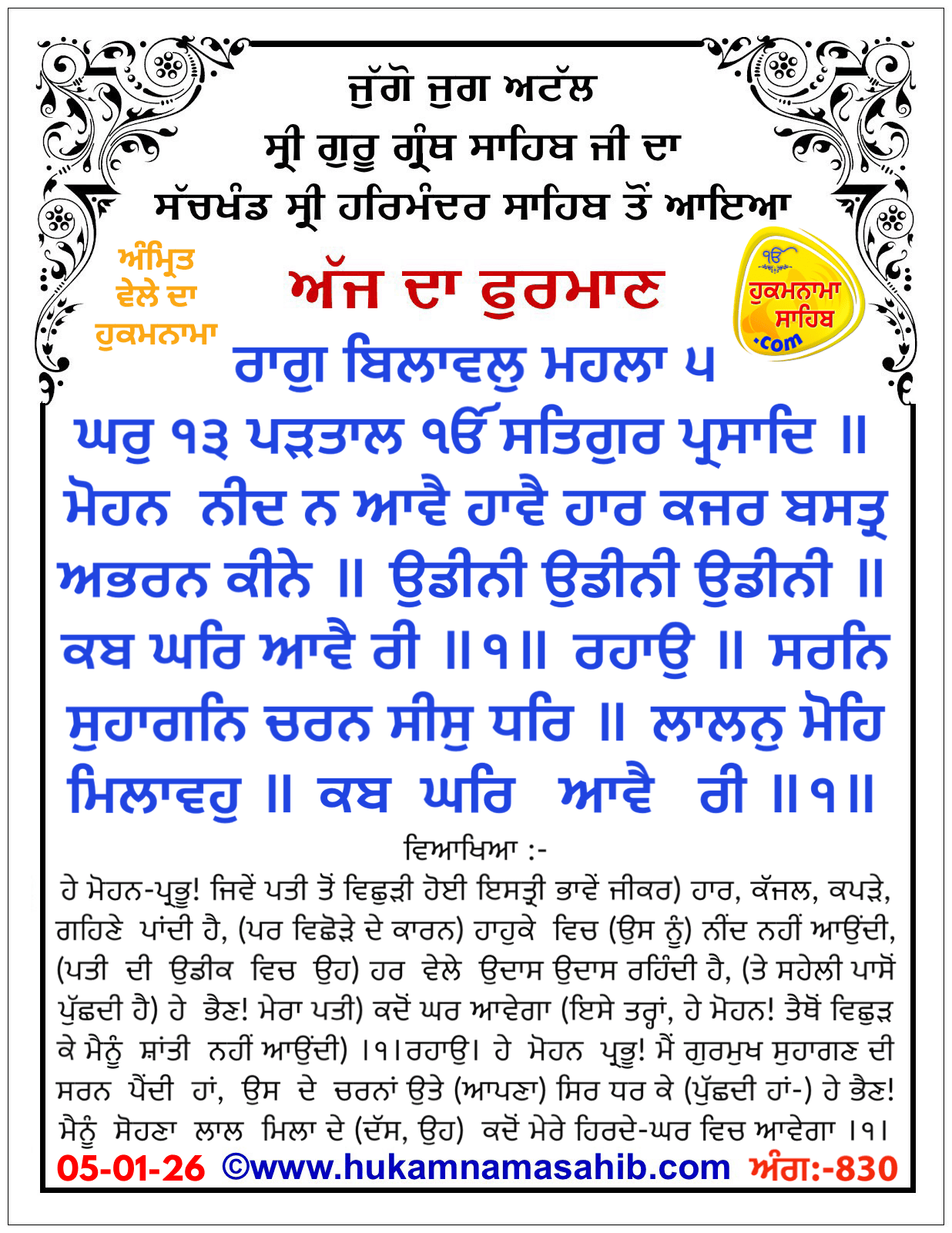 Amrit Vele da Hukamnama, Sri Darbar Sahib, Amritsar Sahib Ang 830, 05-01-26