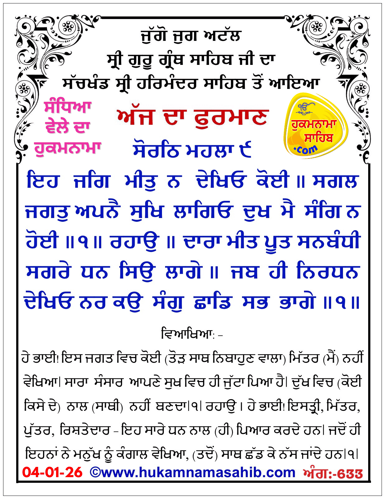 SANDHIA VELE DA HUKAMNAMA SRI DARBAR SAHIB AMRITSAR