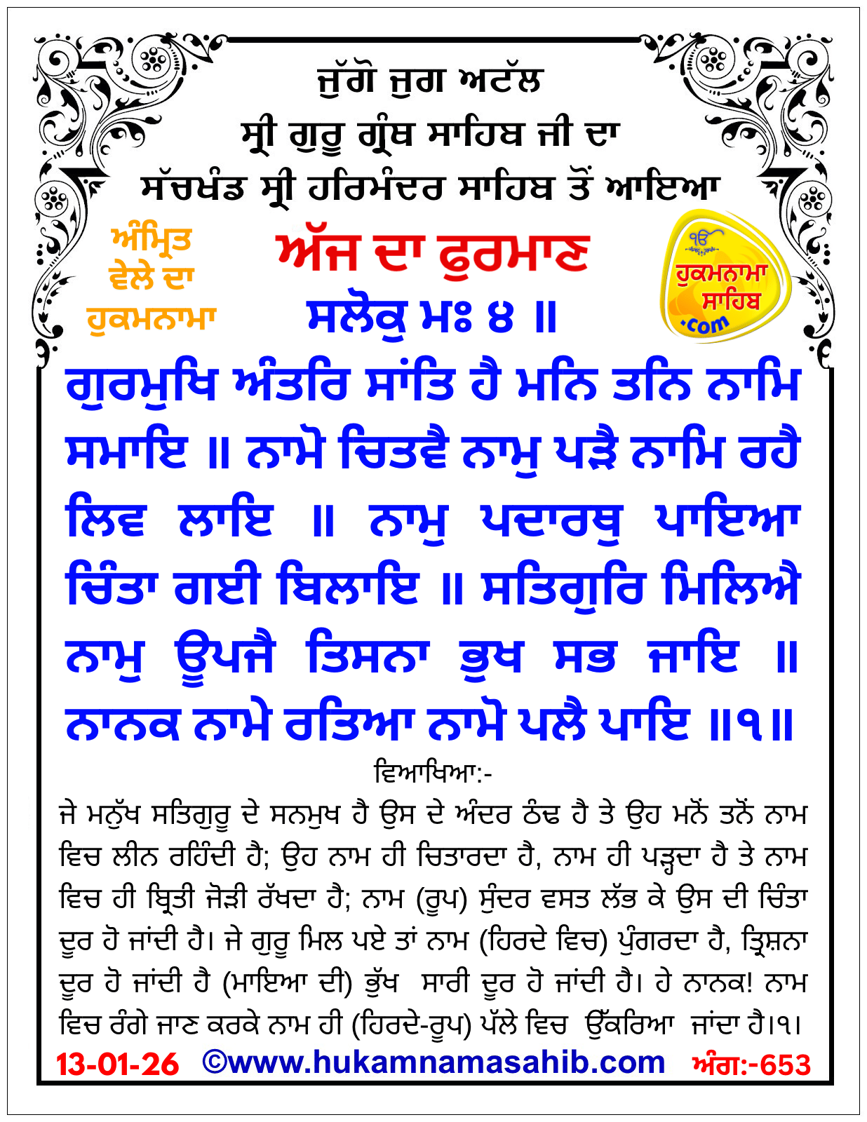 ਸਲੋਕੁ ਮਃ ੪ ॥ ਗੁਰਮੁਖਿ ਅੰਤਰਿ ਸਾਂਤਿ ਹੈ ਮਨਿ ਤਨਿ ਨਾਮਿ ਸਮਾਇ ॥ ਨਾਮੋ ਚਿਤਵੈ ਨਾਮੁ ਪੜੈ ਨਾਮਿ ਰਹੈ ਲਿਵ ਲਾਇ ॥ ਨਾਮੁ ਪਦਾਰਥੁ ਪਾਇਆ ਚਿੰਤਾ ਗਈ ਬਿਲਾਇ ॥ ਸਤਿਗੁਰਿ ਮਿਲਿਐ ਨਾਮੁ ਊਪਜੈ ਤਿਸਨਾ ਭੁਖ ਸਭ ਜਾਇ ॥ ਨਾਨਕ ਨਾਮੇ ਰਤਿਆ ਨਾਮੋ ਪਲੈ ਪਾਇ ॥੧॥ ਮਃ ੪ ॥ ਸਤਿਗੁਰ ਪੁਰਖਿ ਜਿ ਮਾਰਿਆ ਭ੍ਰਮਿ ਭ੍ਰਮਿਆ ਘਰੁ ਛੋਡਿ ਗਇਆ ॥ ਓਸੁ ਪਿਛੈ ਵਜੈ ਫਕੜੀ ਮੁਹੁ ਕਾਲਾ ਆਗੈ ਭਇਆ ॥ ਓਸੁ ਅਰਲੁ ਬਰਲੁ ਮੁਹਹੁ ਨਿਕਲੈ ਨਿਤ ਝਗੂ ਸੁਟਦਾ ਮੁਆ ॥ ਕਿਆ ਹੋਵੈ ਕਿਸੈ ਹੀ ਦੈ ਕੀਤੈ ਜਾਂ ਧੁਰਿ ਕਿਰਤੁ ਓਸ ਦਾ ਏਹੋ ਜੇਹਾ ਪਇਆ ॥ ਜਿਥੈ ਓਹੁ ਜਾਇ ਤਿਥੈ ਓਹੁ ਝੂਠਾ ਕੂੜੁ ਬੋਲੇ ਕਿਸੈ ਨ ਭਾਵੈ ॥ ਵੇਖਹੁ ਭਾਈ ਵਡਿਆਈ ਹਰਿ ਸੰਤਹੁ ਸੁਆਮੀ ਅਪੁਨੇ ਕੀ ਜੈਸਾ ਕੋਈ ਕਰੈ ਤੈਸਾ ਕੋਈ ਪਾਵੈ ॥ ਏਹੁ ਬ੍ਰਹਮ ਬੀਚਾਰੁ ਹੋਵੈ ਦਰਿ ਸਾਚੈ ਅਗੋ ਦੇ ਜਨੁ ਨਾਨਕੁ ਆਖਿ ਸੁਣਾਵੈ ॥੨॥ ਪਉੜੀ ॥ ਗੁਰਿ ਸਚੈ ਬਧਾ ਥੇਹੁ ਰਖਵਾਲੇ ਗੁਰਿ ਦਿਤੇ ॥ ਪੂਰਨ ਹੋਈ ਆਸ ਗੁਰ ਚਰਣੀ ਮਨ ਰਤੇ ॥ ਗੁਰਿ ਕ੍ਰਿਪਾਲਿ ਬੇਅੰਤਿ ਅਵਗੁਣ ਸਭਿ ਹਤੇ ॥ ਗੁਰਿ ਅਪਣੀ ਕਿਰਪਾ ਧਾਰਿ ਅਪਣੇ ਕਰਿ ਲਿਤੇ ॥ ਨਾਨਕ ਸਦ ਬਲਿਹਾਰ ਜਿਸੁ ਗੁਰ ਕੇ ਗੁਣ ਇਤੇ ॥੨੭॥