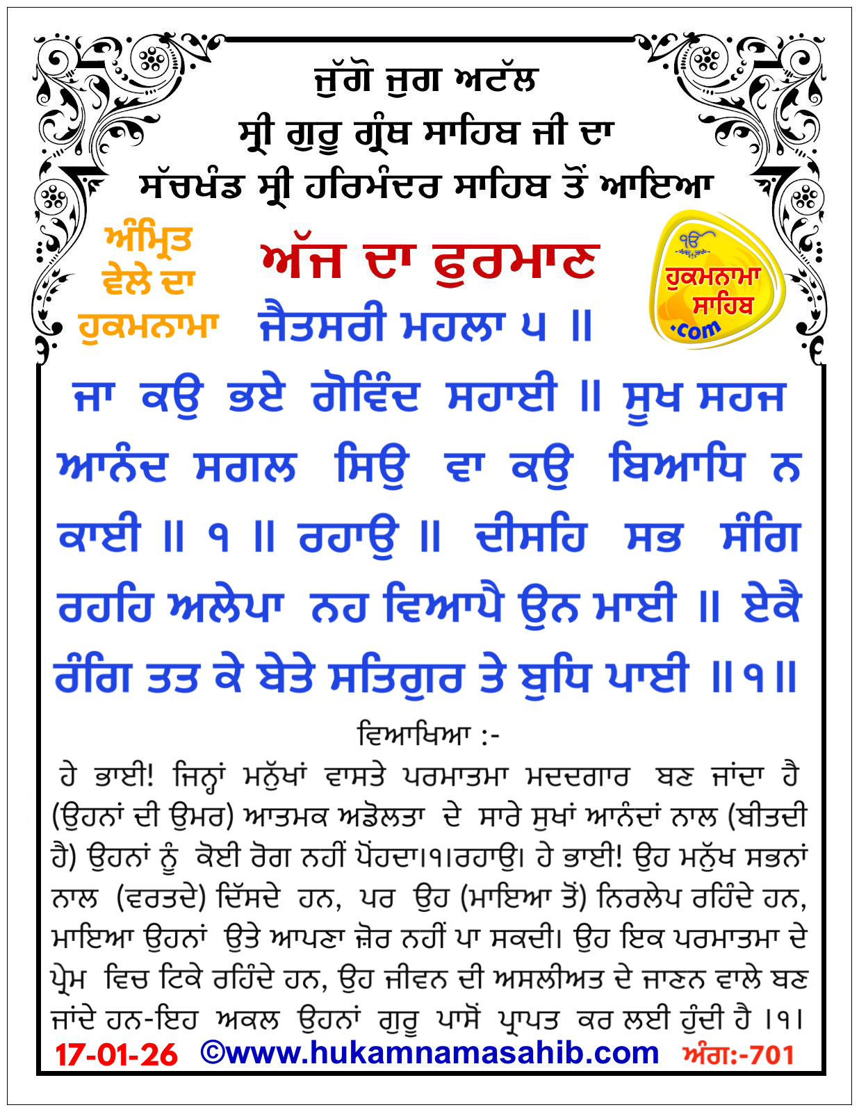 Sachkhand Sri Harmandir Sahib Sri Amritsar Sahib Ji Vekha Hoea Amrit Wela Da Mukhwak: 17-01-2026, Ang 701