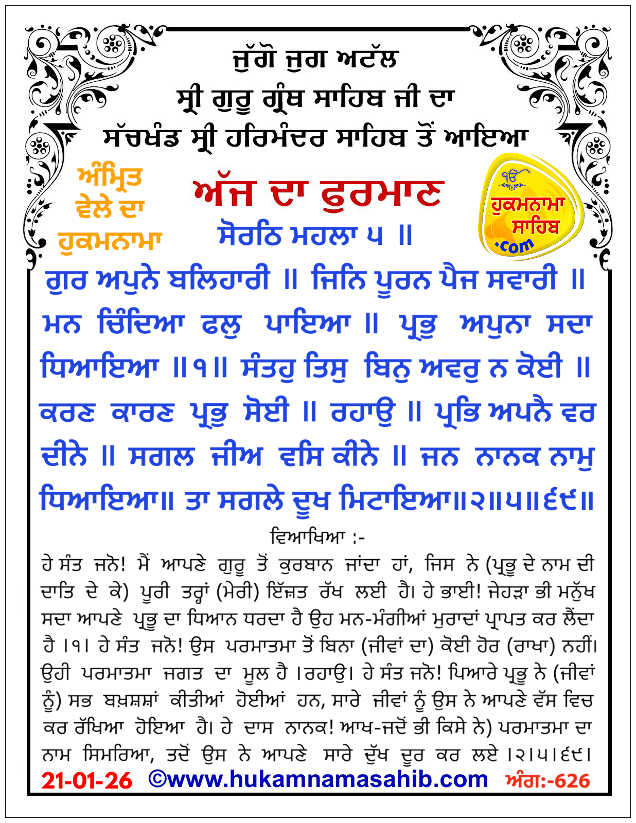 Amrit Vele Da Hukamnama Sri Darbar Sahib, Amritsar, Date 21-01-2026 Ang 636