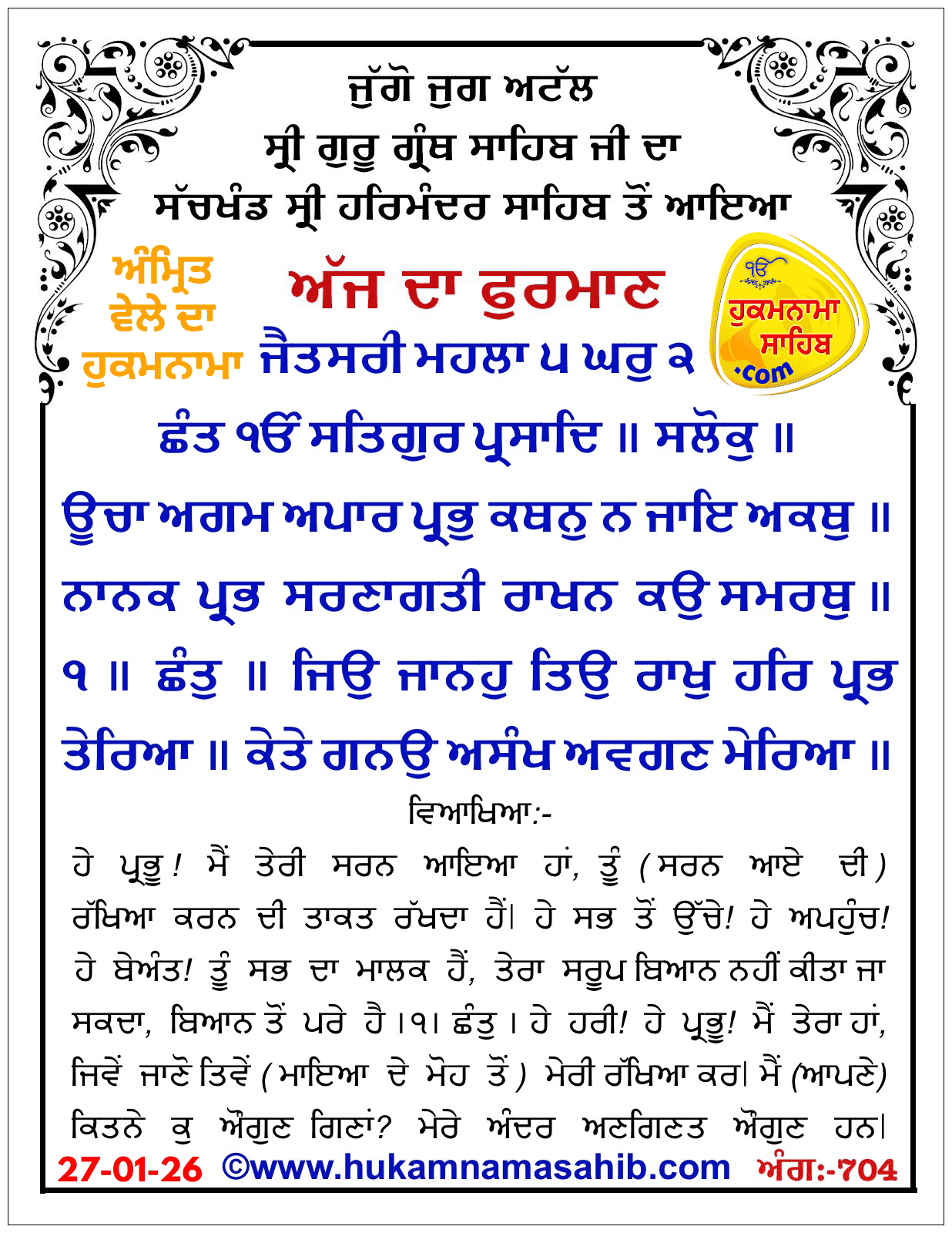 Amrit Vele Da Hukamnama Sri Darbar Sahib, Amritsar, Date 27-01-2026 Ang 704