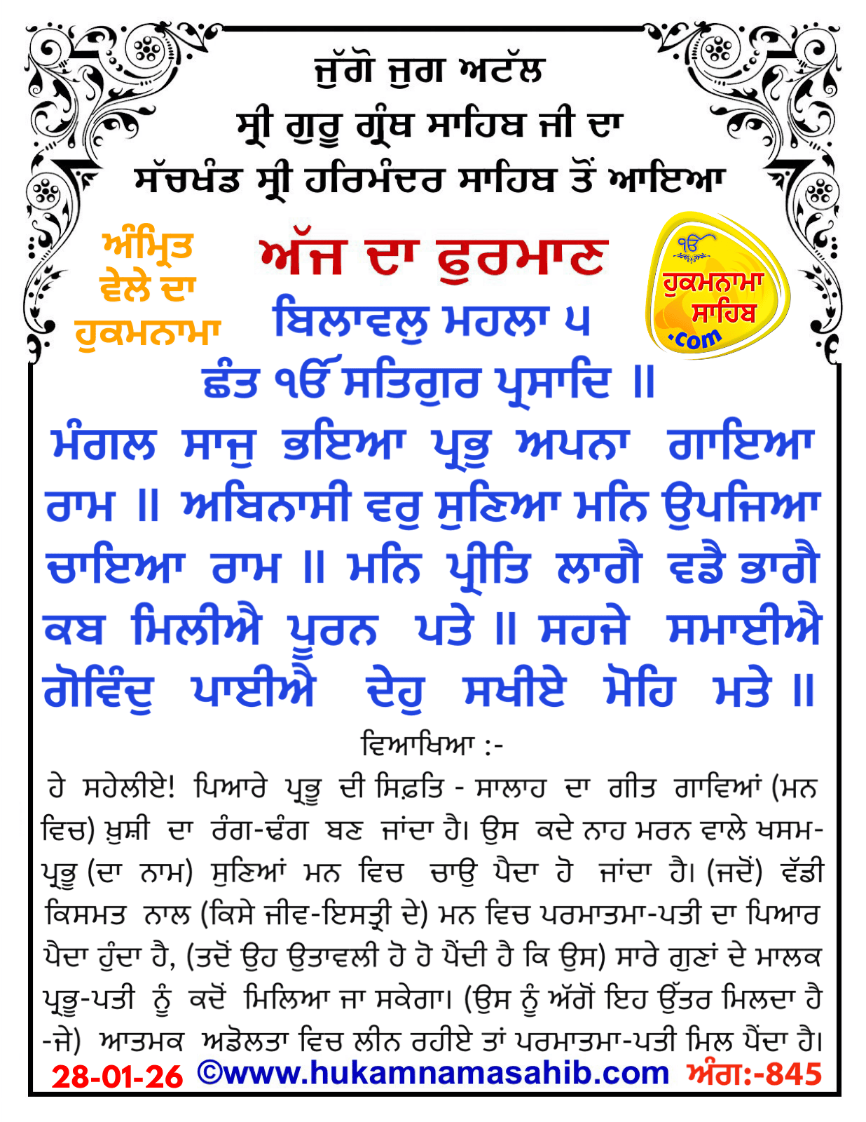 Amritvele da Hukamnama Sri Darbar Sahib, Sri Amritsar, Ang 845, 28-01-2026