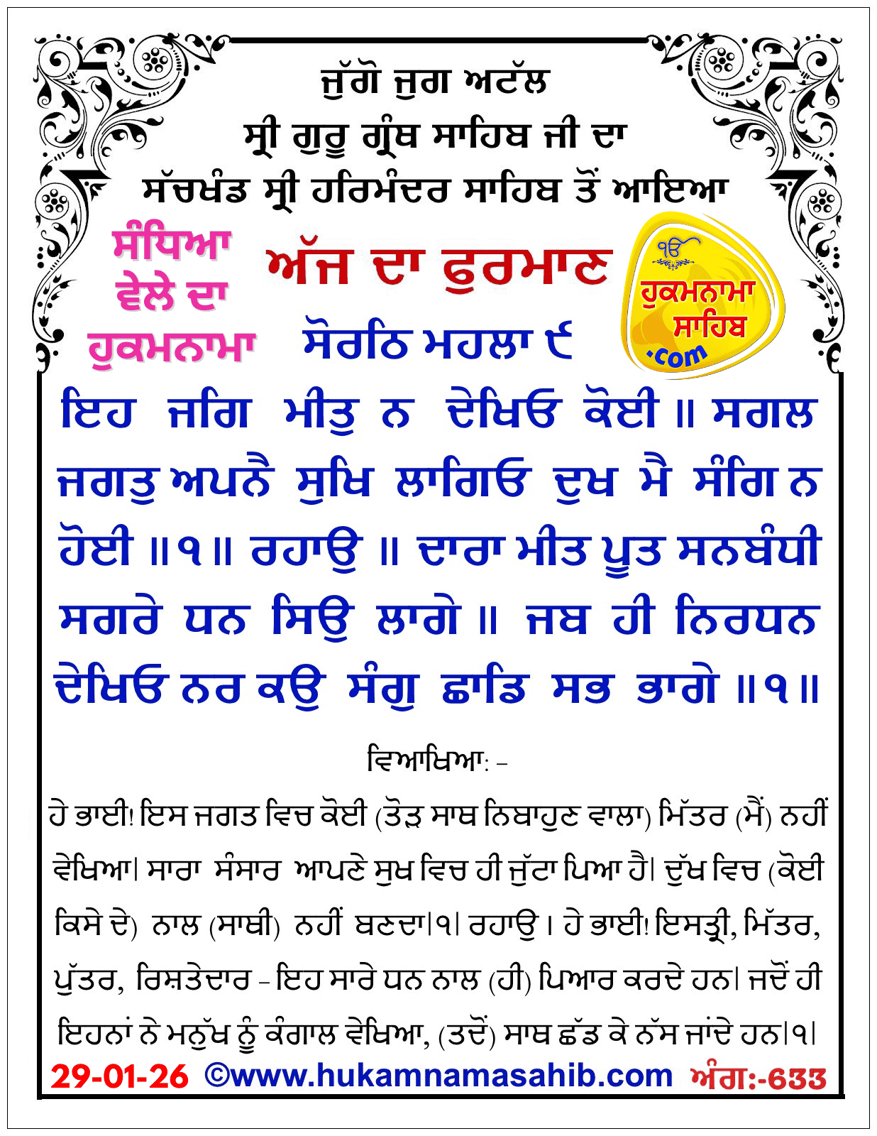 Sandhia Vele Da Hukamnama Sri Darbar Sahib, Amritsar, Date 29-01-2026 Ang 633
