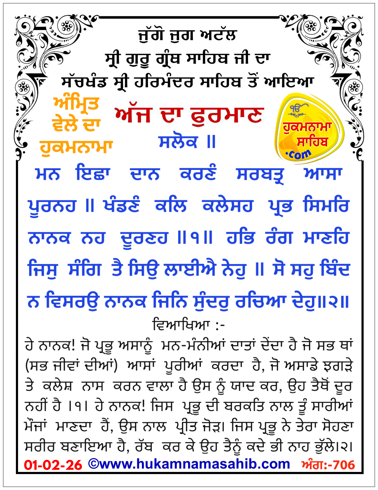Amrit Vele Da Hukamnama Sri Darbar Sahib, Amritsar, Date 01-02-2026 Ang 706