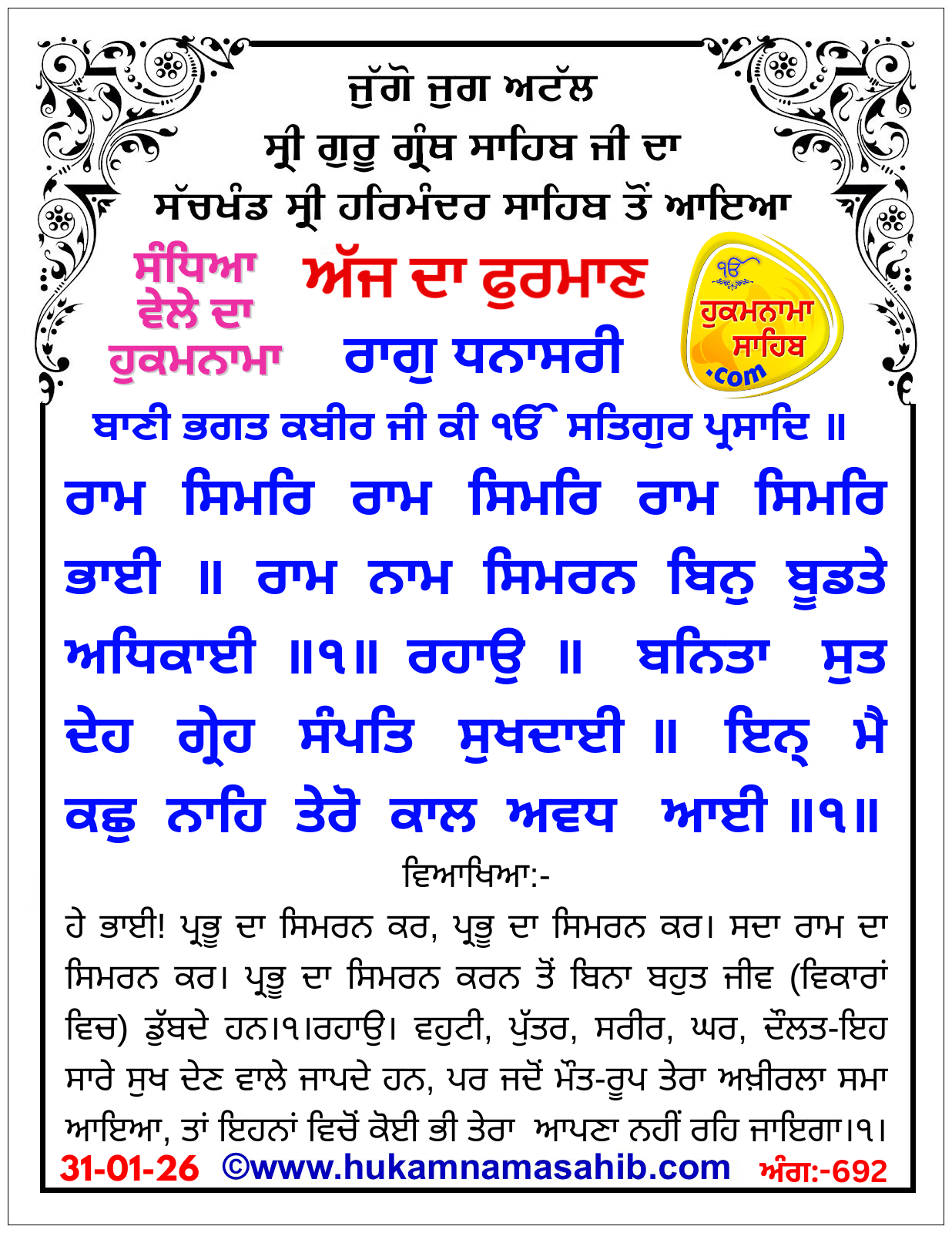 ਅਰਥ: ਰਾਗ ਧਨਾਸਰੀ ਵਿੱਚ ਭਗਤ ਕਬੀਰ ਜੀ ਦੀ ਬਾਣੀ। ਅਕਾਲ ਪੁਰਖ ਇੱਕ ਹੈ ਅਤੇ ਸਤਿਗੁਰੂ ਦੀ ਕਿਰਪਾ ਨਾਲ ਮਿਲਦਾ ਹੈ। ਹੇ ਭਾਈ! ਪ੍ਰਭੂ ਦਾ ਸਿਮਰਨ ਕਰ, ਪ੍ਰਭੂ ਦਾ ਸਿਮਰਨ ਕਰ। ਸਦਾ ਰਾਮ ਦਾ ਸਿਮਰਨ ਕਰ। ਪ੍ਰਭੂ ਦਾ ਸਿਮਰਨ ਕਰਨ ਤੋਂ ਬਿਨਾ ਬਹੁਤ ਜੀਵ (ਵਿਕਾਰਾਂ ਵਿਚ) ਡੁੱਬਦੇ ਹਨ ॥੧॥ ਰਹਾਉ ॥ ਵਹੁਟੀ, ਪੁੱਤਰ, ਸਰੀਰ, ਘਰ, ਦੌਲਤ – ਇਹ ਸਾਰੇ ਸੁਖ ਦੇਣ ਵਾਲੇ ਜਾਪਦੇ ਹਨ, ਪਰ ਜਦੋਂ ਮੌਤ-ਰੂਪ ਤੇਰਾ ਅਖ਼ੀਰਲਾ ਸਮਾ ਆਇਆ, ਤਾਂ ਇਹਨਾਂ ਵਿਚੋਂ ਕੋਈ ਭੀ ਤੇਰਾ ਆਪਣਾ ਨਹੀਂ ਰਹਿ ਜਾਇਗਾ ॥੧॥ ਅਜਾਮਲ, ਗਜ, ਗਨਿਕਾ – ਇਹ ਵਿਕਾਰ ਕਰਦੇ ਰਹੇ, ਪਰ ਜਦੋਂ ਪਰਮਾਤਮਾ ਦਾ ਨਾਮ ਇਹਨਾਂ ਨੇ ਸਿਮਰਿਆ, ਤਾਂ ਇਹ ਭੀ (ਇਹਨਾਂ ਵਿਕਾਰਾਂ ਵਿਚੋਂ) ਪਾਰ ਲੰਘ ਗਏ ॥੨॥ (ਹੇ ਸੱਜਣ!) ਤੂੰ ਸੂਰ, ਕੁੱਤੇ ਆਦਿਕ ਦੀਆਂ ਜੂਨੀਆਂ ਵਿਚ ਭਟਕਦਾ ਰਿਹਾ, ਫਿਰ ਭੀ ਤੈਨੂੰ (ਹੁਣ) ਸ਼ਰਮ ਨਹੀਂ ਆਈ (ਤੂੰ ਅਜੇ ਭੀ ਨਾਮ ਨਹੀਂ ਸਿਮਰਦਾ)। ਪਰਮਾਤਮਾ ਦਾ ਅੰਮ੍ਰਿਤ-ਨਾਮ ਵਿਸਾਰ ਕੇ ਕਿਉਂ (ਵਿਕਾਰਾਂ ਦਾ) ਜ਼ਹਿਰ ਖਾ ਰਿਹਾ ਹੈਂ ? ॥੩॥ (ਹੇ ਭਾਈ!) ਸ਼ਾਸਤ੍ਰਾਂ ਅਨੁਸਾਰ ਕੀਤੇ ਜਾਣ ਵਾਲੇ ਕਿਹੜੇ ਕੰਮ ਹਨ, ਤੇ ਸ਼ਾਸਤ੍ਰਾਂ ਵਿਚ ਕਿਨ੍ਹਾਂ ਕੰਮਾਂ ਬਾਰੇ ਮਨਾਹੀ ਹੈ – ਇਹ ਵਹਿਮ ਛੱਡ ਦੇਹ, ਤੇ ਪਰਮਾਤਮਾ ਦਾ ਨਾਮ ਸਿਮਰ। ਹੇ ਦਾਸ ਕਬੀਰ ਜੀ! ਤੂੰ ਆਪਣੇ ਗੁਰੂ ਦੀ ਕਿਰਪਾ ਨਾਲ ਆਪਣੇ ਪਰਮਾਤਮਾ ਨੂੰ ਹੀ ਆਪਣਾ ਪਿਆਰਾ (ਸਾਥੀ) ਬਣਾ ॥੪॥੫॥