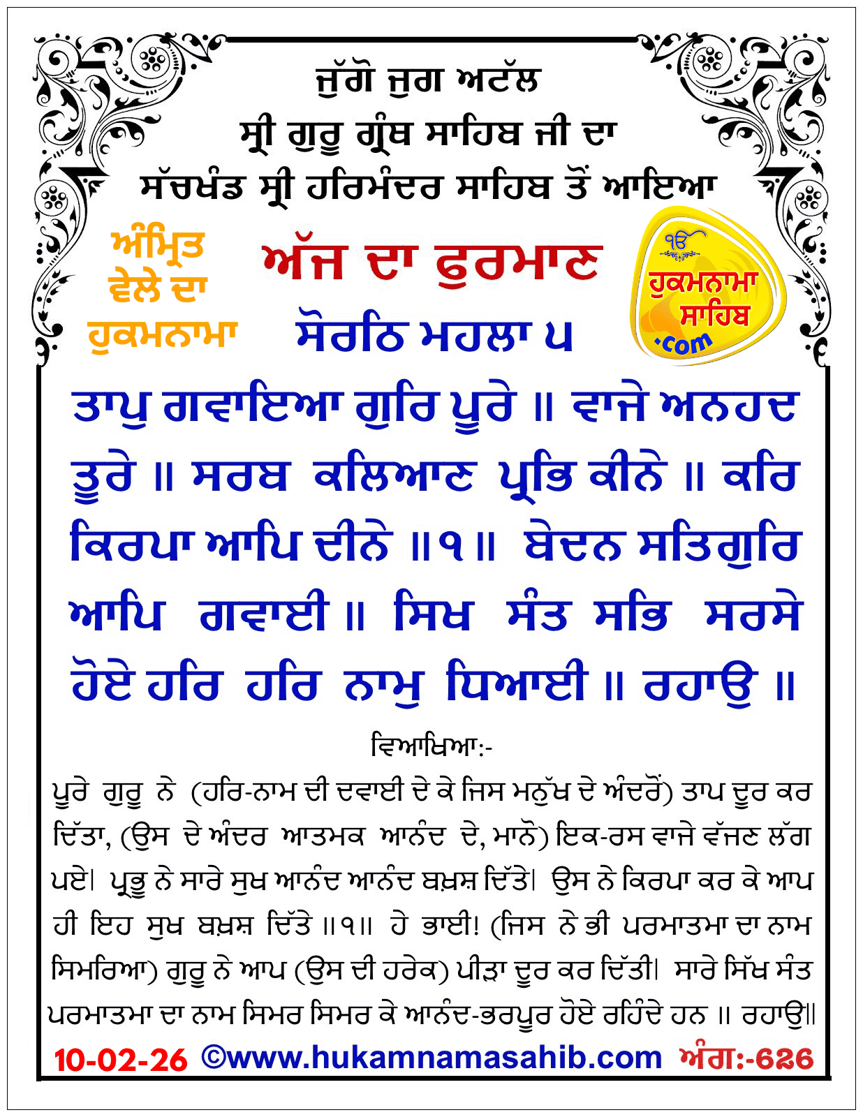 अर्थ :- पूरे गुरु ने (हरि-नाम की दवाई दे के जिस मनुख के अंदर से) ताप दूर कर दिया, (उस के अंदर आत्मिक आनंद के, मानो) एक-रस बाजे बजने लग गए। भगवान ने कृपा कर के आप ही वह सारे सुख आनंद बख्श दिये।१। हे भाई ! सारे सिक्ख संत परमात्मा का नाम सिमर सिमर के आनंद-भरपूर हुए रहते हैं। (जिस ने भी परमात्मा का नाम सुमिरा) गुरु ने आप (उस की हरेक) पीड़ा दूर कर दी ।रहाउ। हे भगवान! (तेरे दर से तेरे संत जन) जो कुछ माँगते हैं, वह हासिल कर लेते हैं। तूं आपने संतो को (आप सब कुछ) देता हैं। (हे भाई! बालक) हरि गोबिंद को (भी) भगवान ने (आप) बचाया है (किसी देवी आदि ने नहीं) हे दास नानक ! (बोल-) मैं तो सदा-थिर रहने वाले भगवान का नाम ही उचारता हूँ।२।६।७०।