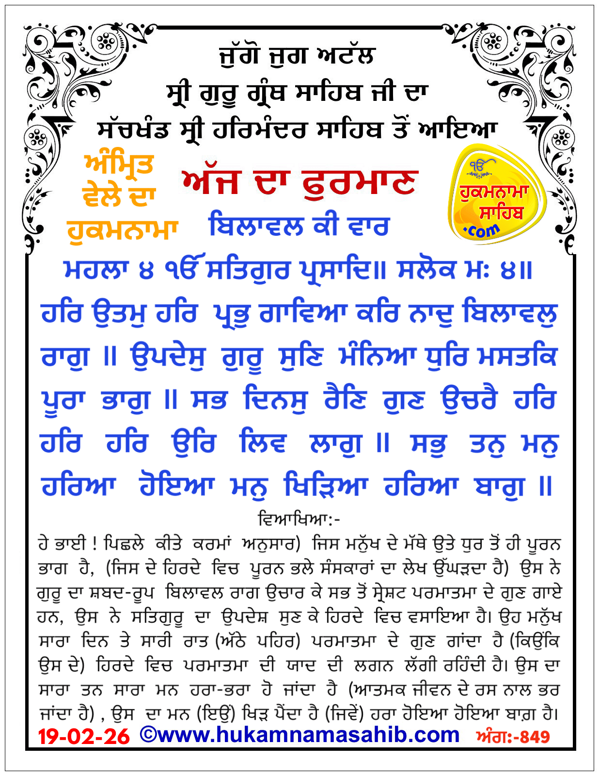 Amrit vele da Hukamnama Sri Darbar Sahib Sri Amritsar, Ang 849, 19-02-2026