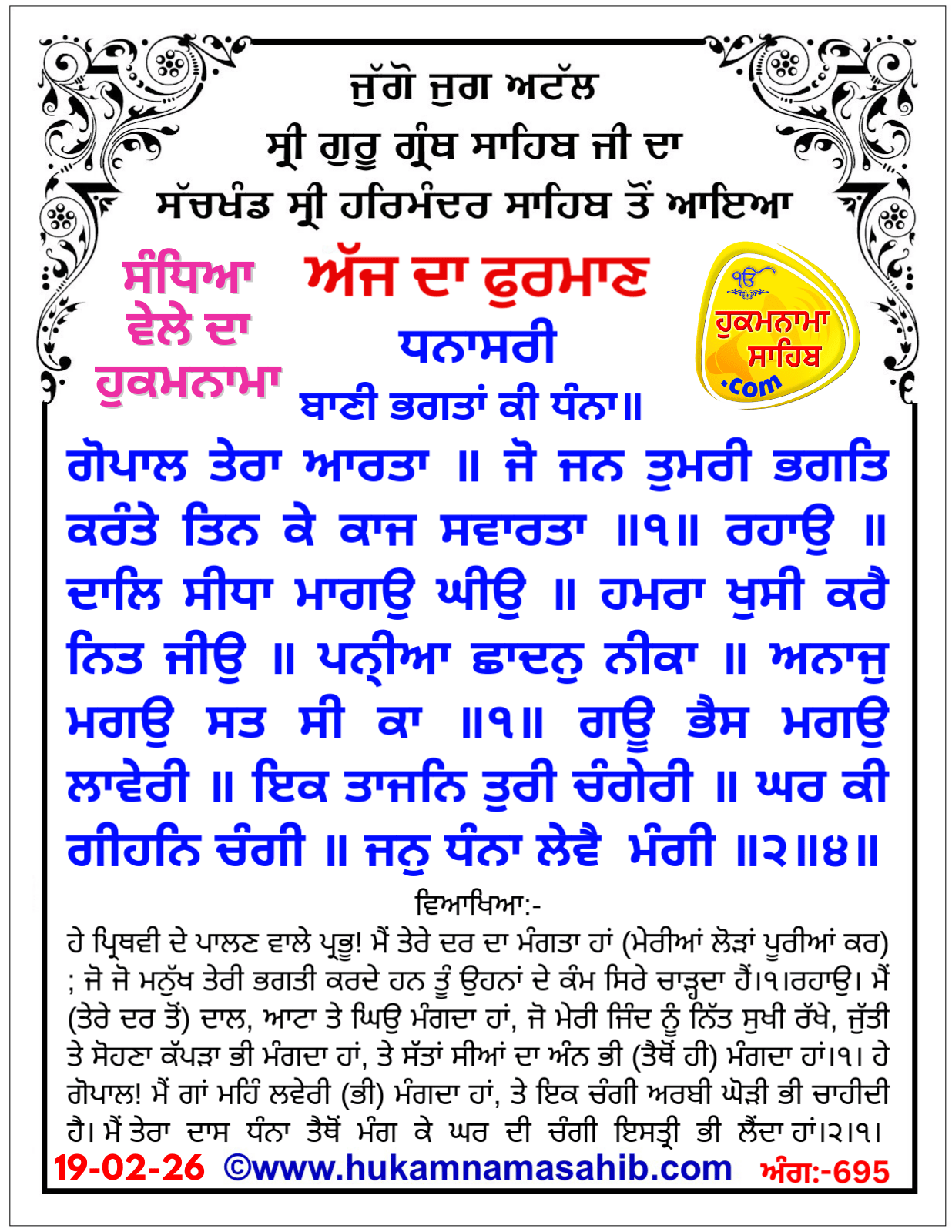 Sandhia Vele Da Hukamnama Sri Darbar Sahib, Amritsar, Date 19-02-2026 Ang 695