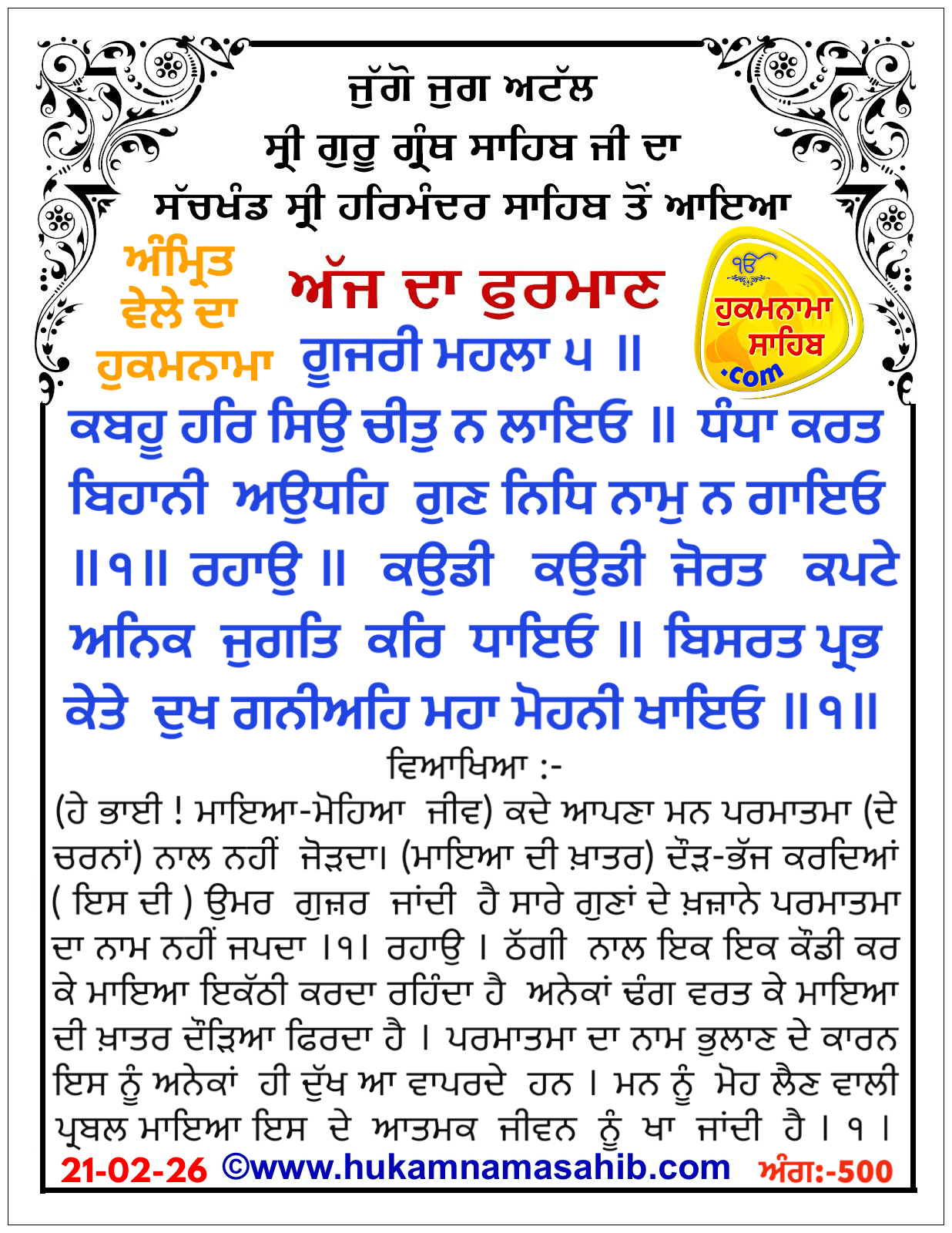 Amrit Vele da Hukamnana Sri Darbar Sahib, Sri Amritsar, Ang 500, 21-02-2026