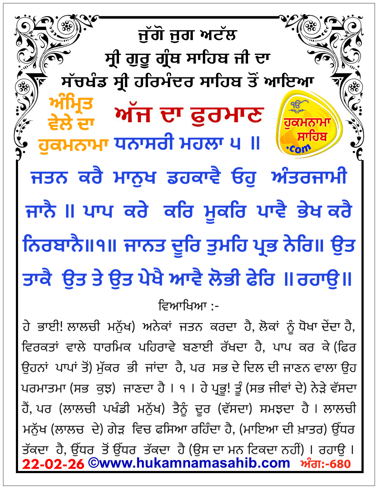 Amrit Vele Da Hukamnama Sri Darbar Sahib, Amritsar, Date 22-02-2026 Ang 680