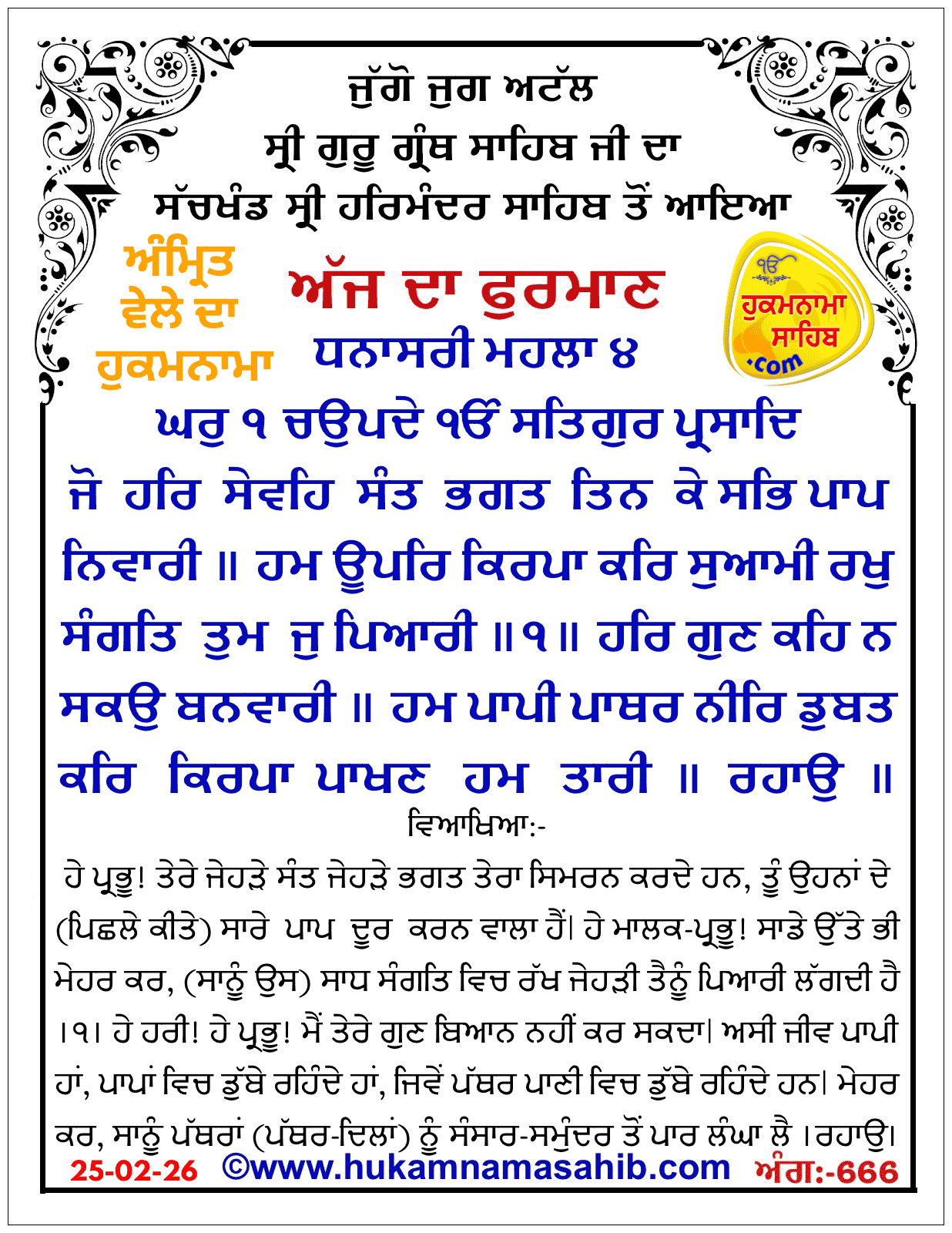 Sachkhand Sri Harmandir Sahib Amritsar Vekhe Hoea Amrit Wele Da Mukhwak: 25-02-26, Ang 666