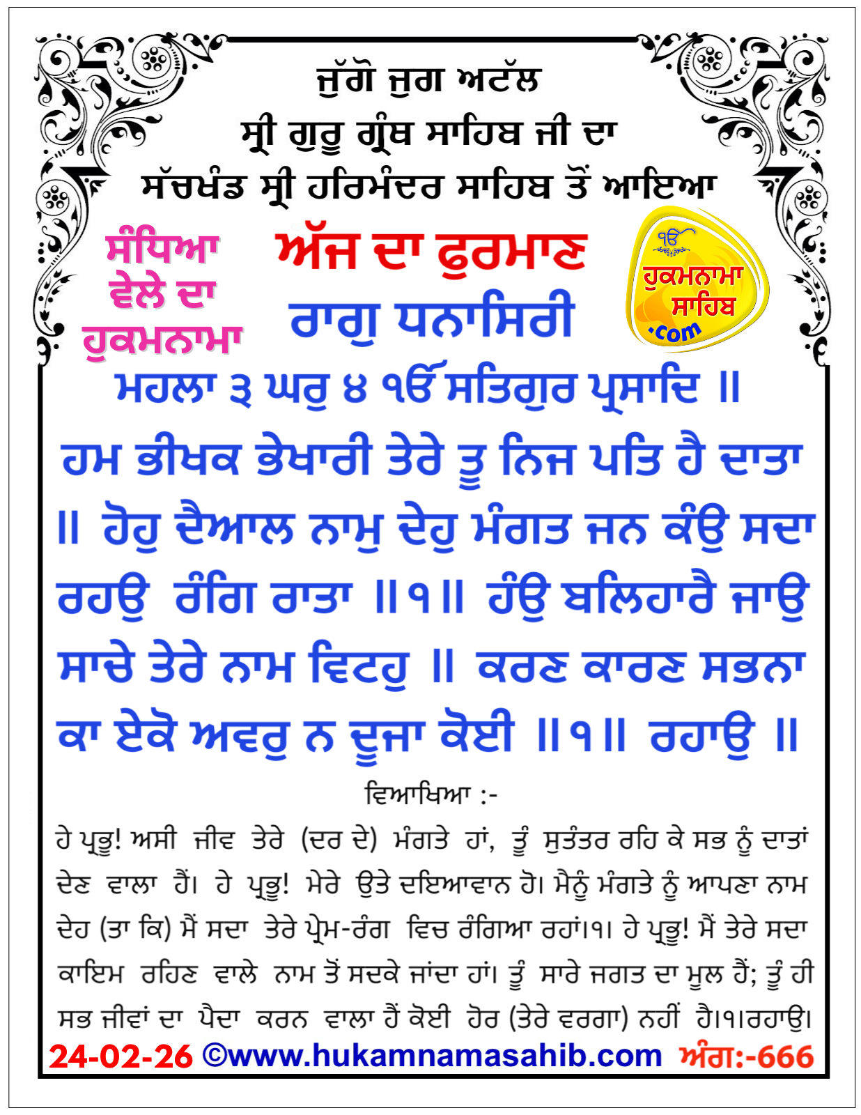 Sandhia Vele Da Hukamnama Sri Darbar Sahib, Amritsar, Date 24-02-2026 Ang 666