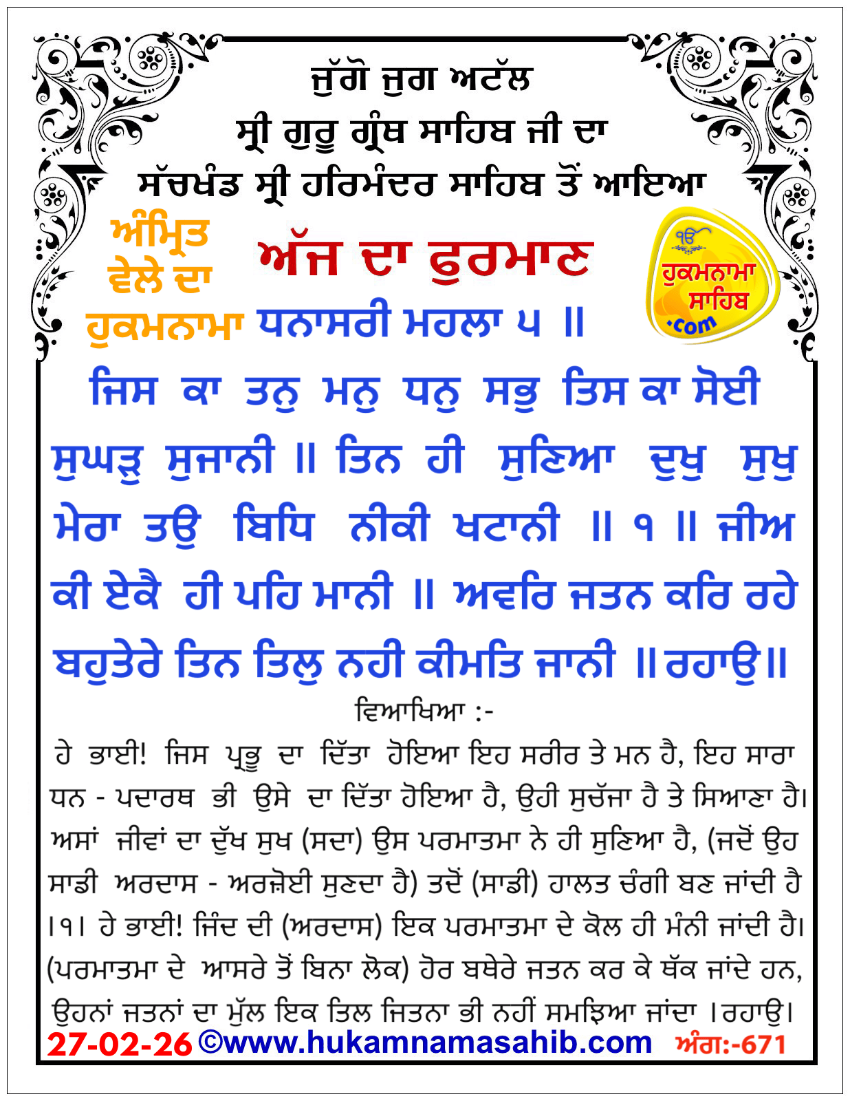 Amrit Vele Da Hukamnama Sri Darbar Sahib, Amritsar, Date 27-02-2026 Ang 671