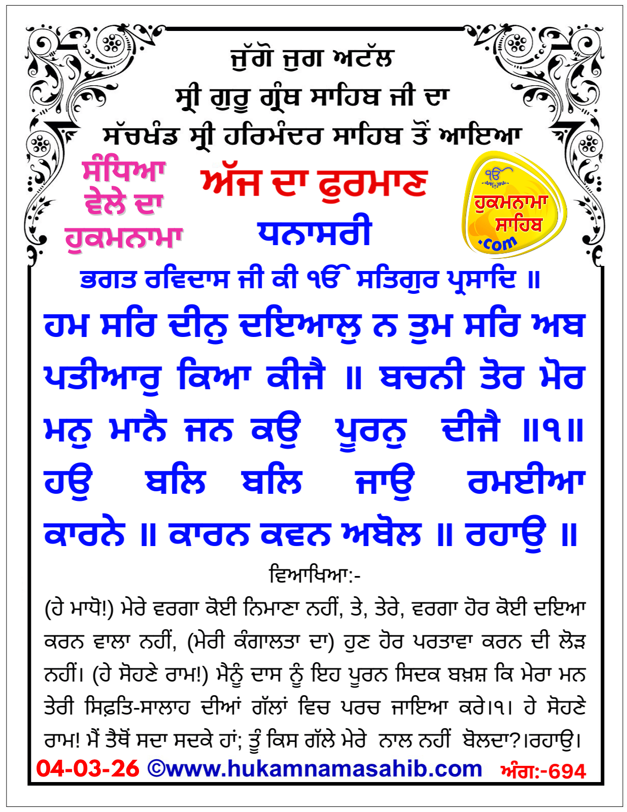 Sandhiya Vele da Hukamnama Sri Darbar Sahib, Sri Amritsar