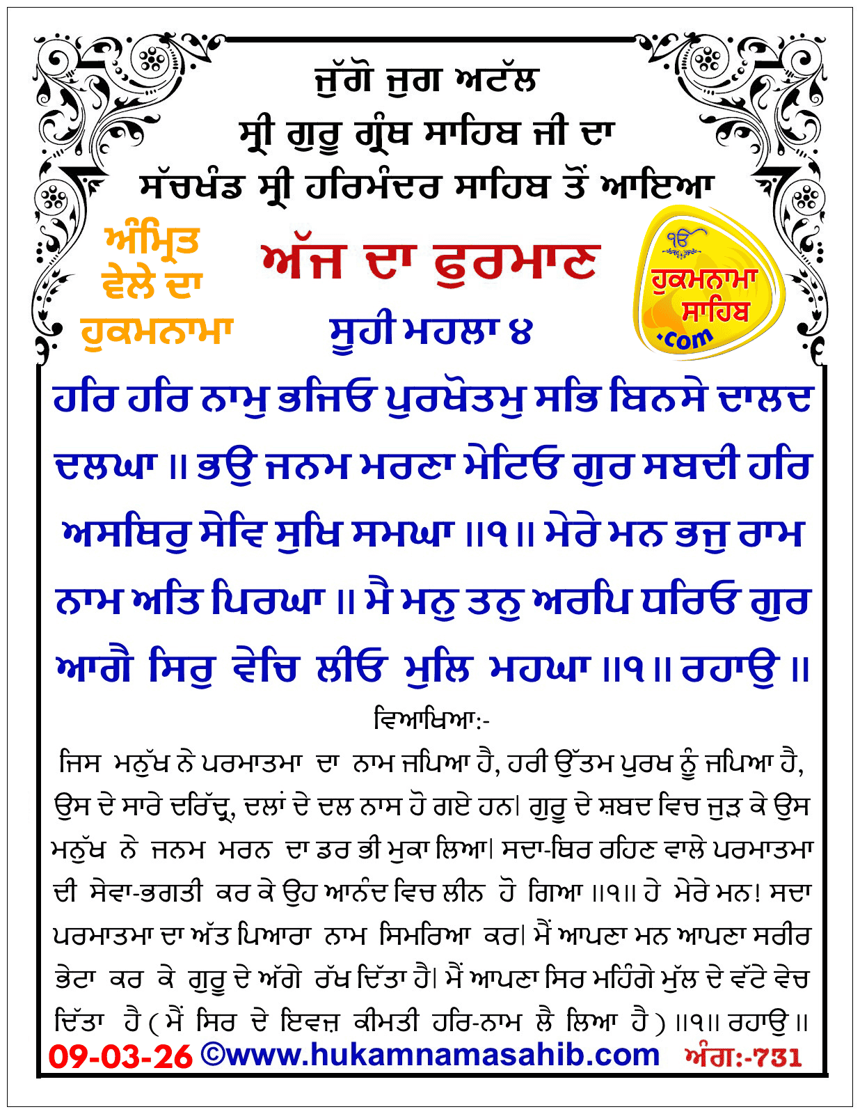 AMRIT VELE DA HUKAMNAMA SRI DARBAR SAHIB SRI AMRITSAR
