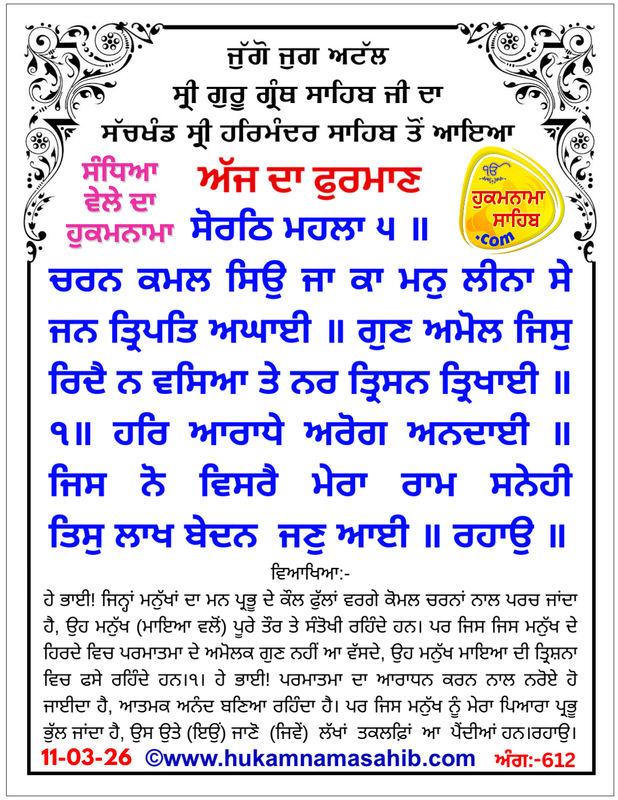 SANDHIYA VELE DA HUKAMNAMA SRI DARBAR SAHIB, AMRITSAR