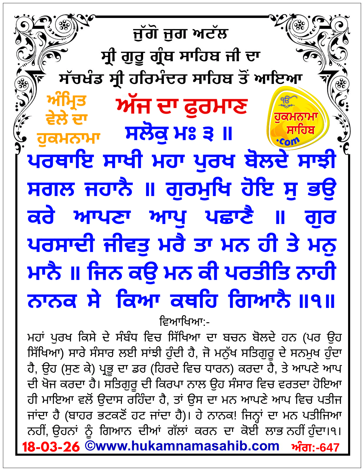 ਸਲੋਕੁ ਮ: ੩ ॥ ਪਰਥਾਇ ਸਾਖੀ ਮਹਾ ਪੁਰਖ ਬੋਲਦੇ ਸਾਝੀ ਸਗਲ ਜਹਾਨੈ ॥ ਗੁਰਮੁਖਿ ਹੋਇ ਸੁ ਭਉ ਕਰੇ ਆਪਣਾ ਆਪੁ ਪਛਾਣੈ ॥ ਗੁਰ ਪਰਸਾਦੀ ਜੀਵਤੁ ਮਰੈ ਤਾ ਮਨ ਹੀ ਤੇ ਮਨੁ ਮਾਨੈ ॥ ਜਿਨ ਕਉ ਮਨ ਕੀ ਪਰਤੀਤਿ ਨਾਹੀ ਨਾਨਕ ਸੇ ਕਿਆ ਕਥਹਿ ਗਿਆਨੈ ॥੧॥ ਮਃ ੩ ॥ ਗੁਰਮੁਖਿ ਚਿਤੁ ਨ ਲਾਇਓ ਅੰਤਿ ਦੁਖੁ ਪਹੁਤਾ ਆਇ ॥ ਅੰਦਰਹੁ ਬਾਹਰਹੁ ਅੰਧਿਆਂ ਸੁਧਿ ਨ ਕਾਈ ਪਾਇ ॥ ਪੰਡਿਤ ਤਿਨ ਕੀ ਬਰਕਤੀ ਸਭੁ ਜਗਤੁ ਖਾਇ ਜੋ ਰਤੇ ਹਰਿ ਨਾਇ ॥ ਜਿਨ ਗੁਰ ਕੈ ਸਬਦਿ ਸਲਾਹਿਆ ਹਰਿ ਸਿਉ ਰਹੇ ਸਮਾਇ ॥ ਪੰਡਿਤ ਦੂਜੈ ਭਾਇ ਬਰਕਤਿ ਨ ਹੋਵਈ ਨਾ ਧਨੁ ਪਲੈ ਪਾਇ ॥ ਪੜਿ ਥਕੇ ਸੰਤੋਖੁ ਨ ਆਇਓ ਅਨਦਿਨੁ ਜਲਤ ਵਿਹਾਇ ॥ ਕੂਕ ਪੂਕਾਰ ਨ ਚੁਕਈ ਨਾ ਸੰਸਾ ਵਿਚਹੁ ਜਾਇ ॥ ਨਾਨਕ ਨਾਮ ਵਿਹੂਣਿਆ ਮੁਹਿ ਕਾਲੈ ਉਠਿ ਜਾਇ ॥੨॥ ਪਉੜੀ ॥ ਹਰਿ ਸਜਣ ਮੇਲਿ ਪਿਆਰੇ ਮਿਲਿ ਪੰਥੁ ਦਸਾਈ ॥ ਜੋ ਹਰਿ ਦਸੇ ਮਿਤੁ ਤਿਸੁ ਹਉ ਬਲਿ ਜਾਈ ॥ ਗੁਣ ਸਾਝੀ ਤਿਨ ਸਿਉ ਕਰੀ ਹਰਿ ਨਾਮੁ ਧਿਆਈ ॥ ਹਰਿ ਸੇਵੀ ਪਿਆਰਾ ਨਿਤ ਸੇਵਿ ਹਰਿ ਸੁਖੁ ਪਾਈ ॥ ਬਲਿਹਾਰੀ ਸਤਿਗੁਰ ਤਿਸੁ ਜਿਨਿ ਸੋਝੀ ਪਾਈ ॥੧੨॥