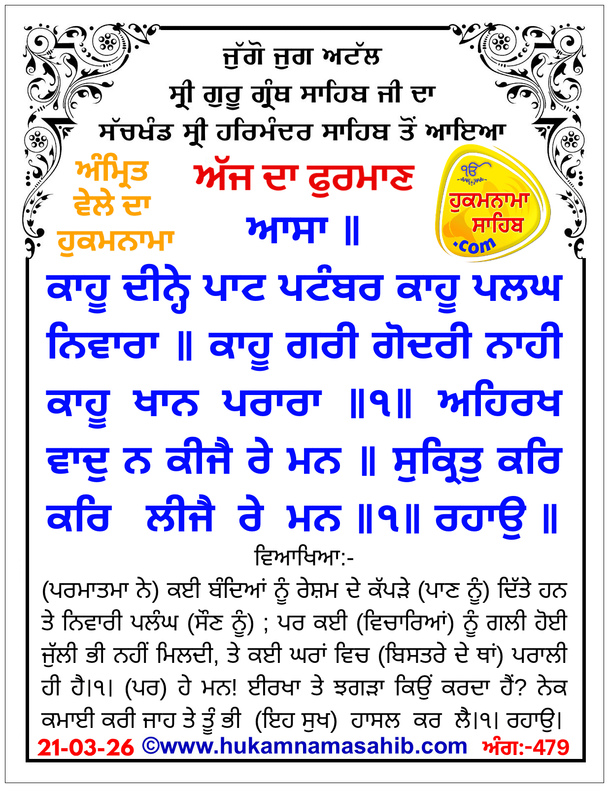 Amrit Vele Da Hukamnama Sri Darbar Sahib, Amritsar, Date 21-03-2026 Ang 479