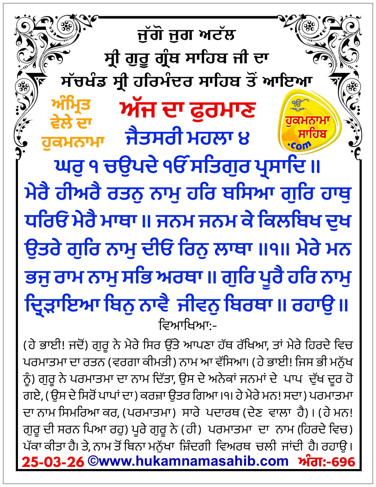 ਅਰਥ: ਰਾਗ ਜੈਤਸਰੀ, ਘਰ ੧ ਵਿੱਚ ਗੁਰੂ ਰਾਮਦਾਸ ਜੀ ਦੀ ਚਾਰ-ਬੰਦਾਂ ਵਾਲੀ ਬਾਣੀ। ਅਕਾਲ ਪੁਰਖ ਇੱਕ ਹੈ ਅਤੇ ਸਤਿਗੁਰੂ ਦੀ ਕਿਰਪਾ ਨਾਲ ਮਿਲਦਾ ਹੈ। (ਹੇ ਭਾਈ! ਜਦੋਂ) ਗੁਰੂ ਨੇ ਮੇਰੇ ਸਿਰ ਉੱਤੇ ਆਪਣਾ ਹੱਥ ਰੱਖਿਆ, ਤਾਂ ਮੇਰੇ ਹਿਰਦੇ ਵਿਚ ਪਰਮਾਤਮਾ ਦਾ ਰਤਨ (ਵਰਗਾ ਕੀਮਤੀ) ਨਾਮ ਆ ਵੱਸਿਆ। (ਹੇ ਭਾਈ! ਜਿਸ ਭੀ ਮਨੁੱਖ ਨੂੰ) ਗੁਰੂ ਨੇ ਪਰਮਾਤਮਾ ਦਾ ਨਾਮ ਦਿੱਤਾ, ਉਸ ਦੇ ਅਨੇਕਾਂ ਜਨਮਾਂ ਦੇ ਪਾਪ ਦੁੱਖ ਦੂਰ ਹੋ ਗਏ, (ਉਸ ਦੇ ਸਿਰੋਂ ਪਾਪਾਂ ਦਾ) ਕਰਜ਼ਾ ਉਤਰ ਗਿਆ ॥੧॥ ਹੇ ਮੇਰੇ ਮਨ! (ਸਦਾ) ਪਰਮਾਤਮਾ ਦਾ ਨਾਮ ਸਿਮਰਿਆ ਕਰ, (ਪਰਮਾਤਮਾ) ਸਾਰੇ ਪਦਾਰਥ (ਦੇਣ ਵਾਲਾ ਹੈ)। (ਹੇ ਮਨ! ਗੁਰੂ ਦੀ ਸਰਨ ਪਿਆ ਰਹੁ) ਪੂਰੇ ਗੁਰੂ ਨੇ (ਹੀ) ਪਰਮਾਤਮਾ ਦਾ ਨਾਮ (ਹਿਰਦੇ ਵਿਚ) ਪੱਕਾ ਕੀਤਾ ਹੈ। ਤੇ, ਨਾਮ ਤੋਂ ਬਿਨਾ ਮਨੁੱਖਾ ਜ਼ਿੰਦਗੀ ਵਿਅਰਥ ਚਲੀ ਜਾਂਦੀ ਹੈ ॥ ਰਹਾਉ ॥ ਹੇ ਭਾਈ! ਜੇਹੜੇ ਮਨੁੱਖ ਆਪਣੇ ਮਨ ਦੇ ਪਿੱਛੇ ਤੁਰਦੇ ਹਨ ਉਹ ਗੁਰੂ (ਦੀ ਸਰਨ) ਤੋਂ ਬਿਨਾ ਮੂਰਖ ਹੋਏ ਰਹਿੰਦੇ ਹਨ, ਉਹ ਸਦਾ ਮਾਇਆ ਦੇ ਮੋਹ ਵਿਚ ਫਸੇ ਰਹਿੰਦੇ ਹਨ। ਉਹਨਾਂ ਨੇ ਕਦੇ ਭੀ ਗੁਰੂ ਦਾ ਆਸਰਾ ਨਹੀਂ ਲਿਆ, ਉਹਨਾਂ ਦਾ ਸਾਰਾ ਜੀਵਨ ਵਿਅਰਥ ਚਲਾ ਜਾਂਦਾ ਹੈ ॥੨॥ ਹੇ ਭਾਈ! ਜੇਹੜੇ ਮਨੁੱਖ ਗੁਰੂ ਦੇ ਚਰਨਾਂ ਦੀ ਓਟ ਲੈਂਦੇ ਹਨ, ਉਹ ਖਸਮ ਵਾਲੇ ਬਣ ਜਾਂਦੇ ਹਨ, ਉਹਨਾਂ ਦੀ ਜ਼ਿੰਦਗੀ ਕਾਮਯਾਬ ਹੋ ਜਾਂਦੀ ਹੈ। ਹੇ ਹਰੀ! ਹੇ ਜਗਤ ਦੇ ਨਾਥ! ਮੇਰੇ ਉੱਤੇ ਮੇਹਰ ਕਰ, ਮੈਨੂੰ ਆਪਣੇ ਦਾਸਾਂ ਦੇ ਦਾਸਾਂ ਦਾ ਦਾਸ ਬਣਾ ਲੈ ॥੩॥ ਹੇ ਗੁਰੂ! ਅਸੀ ਮਾਇਆ ਵਿਚ ਅੰਨ੍ਹੇ ਹੋ ਰਹੇ ਹਾਂ, ਅਸੀਂ ਆਤਮਕ ਜੀਵਨ ਦੀ ਸੂਝ ਤੋਂ ਸੱਖਣੇ ਹਾਂ, ਸਾਨੂੰ ਸਹੀ ਜੀਵਨ-ਜੁਗਤਿ ਦੀ ਸੂਝ ਨਹੀਂ ਹੈ, ਅਸੀ ਤੇਰੇ ਦੱਸੇ ਹੋਏ ਜੀਵਨ-ਰਾਹ ਉੱਤੇ ਤੁਰ ਨਹੀਂ ਸਕਦੇ। ਦਾਸ ਨਾਨਕ ਜੀ! (ਆਖੋ—) ਹੇ ਗੁਰੂ! ਸਾਨੂੰ ਅੰਨ੍ਹਿਆਂ ਨੂੰ ਆਪਣਾ ਪੱਲਾ ਫੜਾ, ਤਾਂ ਕਿ ਤੇਰੇ ਪੱਲੇ ਲੱਗ ਕੇ ਅਸੀ ਤੇਰੇ ਦੱਸੇ ਹੋਏ ਰਸਤੇ ਉਤੇ ਤੁਰ ਸਕੀਏ ॥੪॥੧॥
