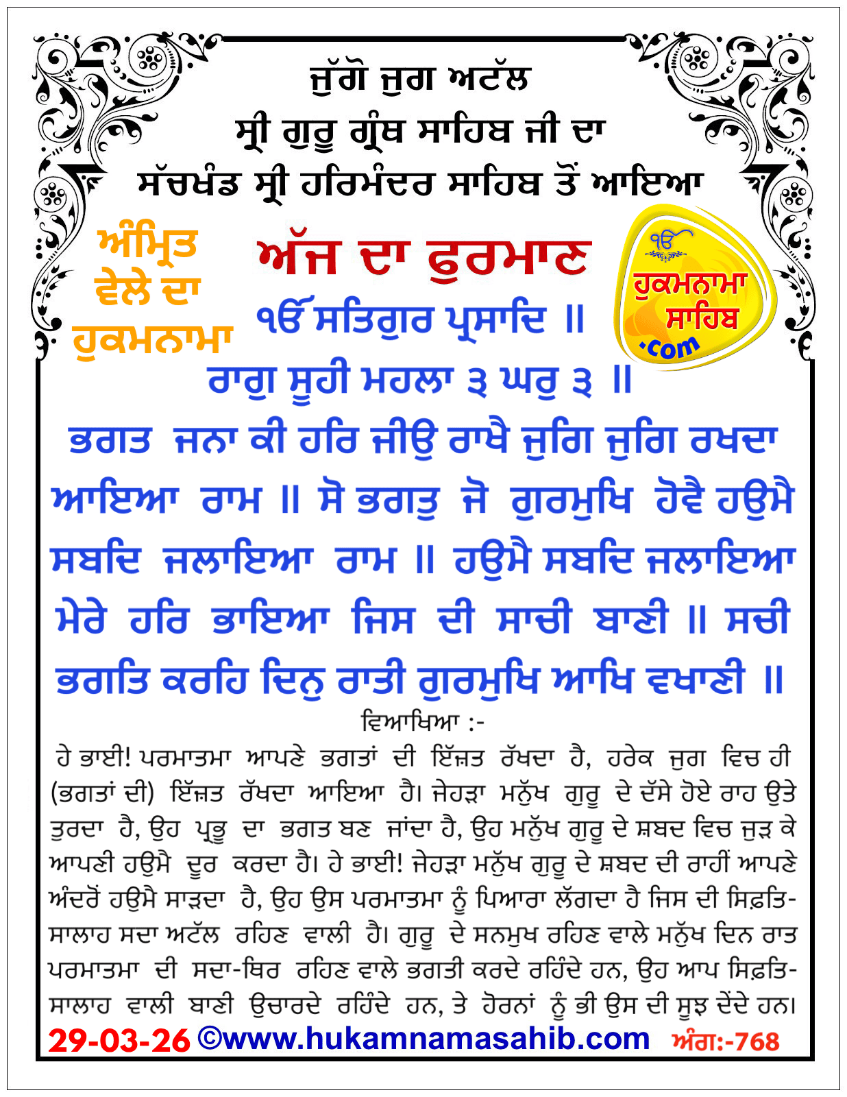 AMRITVELE DA HUKAMNAMA SRI DARBAR SAHIB, SRI AMRITSAR, ANG 768, 29-03-2026