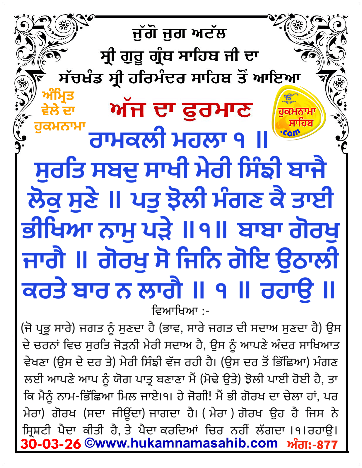 Amrit Vele Da Hukamnama Sri Darbar Sahib, Amritsar, Date 30-03-2026 Ang 877