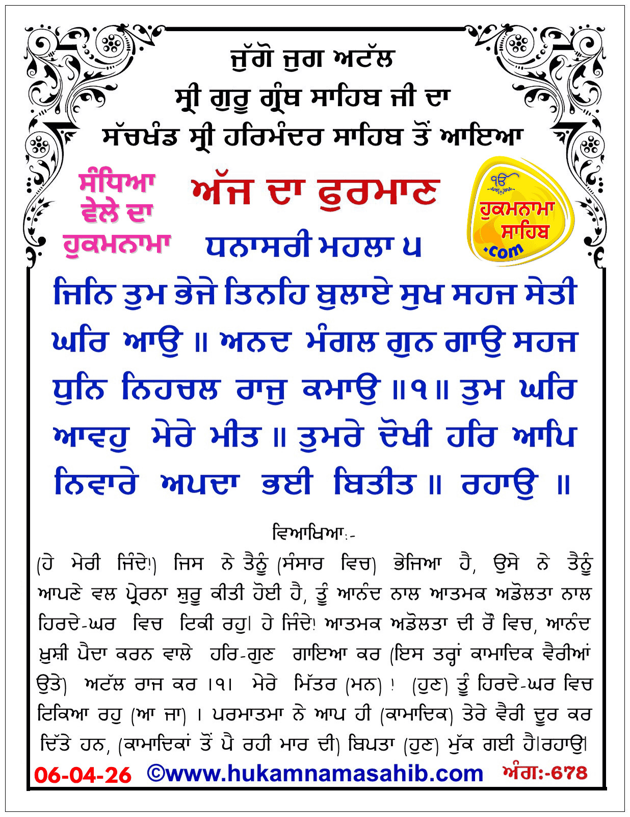 Sandhia Vele Da Hukamnama Sachkhand Sri Harmandir Sahib Amritsar