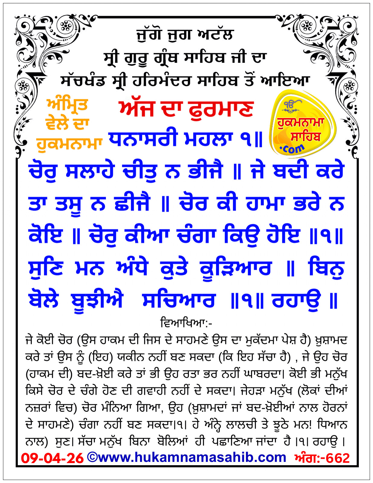 Amrit Vele Da Hukamnama Sri Darbar Sahib, Amritsar, Date 09-04-2026 Ang 662