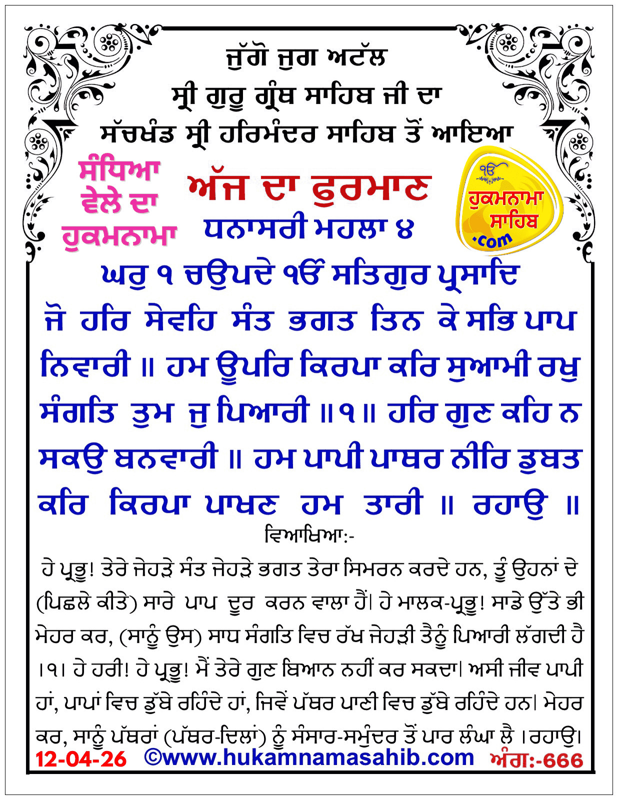 अर्थ: राग धनासरी,घर १ में गुरू रामदास जी की चार-बँदां वाली बाणी। अकाल पुरख एक है और सतगुरु की कृपा द्वारा प्राप्त होता है। हे प्रभु! जो तुम्हारा संत भगत तुम्हारा नाम सिमरन करते हैं, तुम उनके (पूर्व कर्मो) के पाप दूर करने वाले हो। हे मालक प्रभु! हमारे ऊपर भी मेहर कर, (हमें उस) साध सांगत मैं रख जो तुम्हे प्यारी लगती है।।१।। हे हरी! हे प्रभु! में तेरे गुण बयां नहीं कर सकता। हम जीव पापी हैं, पापों में डूबे रहते हैं, जैसे पत्थर पानी में डूबे रहते हैं। मेहर कर, हम पत्थरों (पत्थर दिलो) को संसार समुंदर से पार कर दो जी।।रहाउ।। हे भाई! जैसे सोना अग्नि में तापने से उस की सारी मैल कट जाती है, उत्तार दी जाती है, उसी प्रकार जीवों के अनेकों जन्मो के चिपके हुए पापों का जहर, पापों का जंगल संगत की सरन आ कर ख़तम हो जाता है।।२।। (हे भाई!) मैं (भी) दिन रात परमातमा के नाम का जाप जपता हूँ,नाम जप के उस को अपने हिरदे में वसाई रखता हूँ। हे भाई! परमातमा का नाम जगत में एेसी दवाई है जो अपना असर करना कभी नहीं छोड़ती। यह नाम जप के (अंदरों) हउमै खत्म हो सकती है।।३।। हे अपहुँच! हे मनुषों की समझ से परे! हे परे से परे ! हे सरब-वियापक! हे बेअंत! हे जगत के जीवन! अपने दासों पर मेहर कर,और (इस विकार-भरे संसार-समुंदर में) नानक जी!(कह-) दासों की लाज रख ले ।।४।।१।।