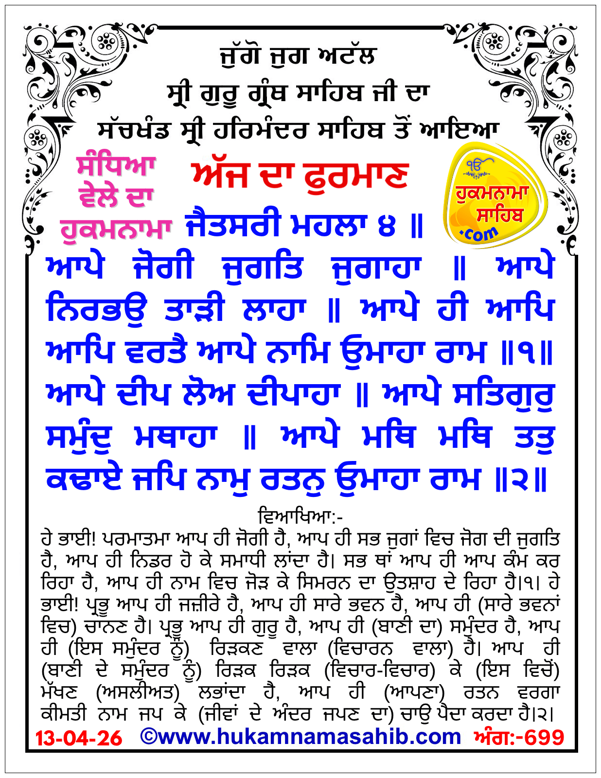 Jaitasaree mahalaa 4 |aape jogee jugat jugaahaa |aape nirbhau taarree laahaa |aape hee aap aap varatai aape naam oumaahaa raam |1|aape deep loa deepaahaa |aape satigur samund mathaahaa |aape math math tat kadtaae jap naam ratan oumaahaa raam |2|sakhee milahu mil gun gaavaahaa |guramukh naam japahu har laahaa |har har bhagat drirree man bhaaee har har naam oumaahaa raam |3|aape vadd daanaa vadd saahaa |guramukh poonjee naam visaahaa |har har daat karahu prabh bhaavai gun naanak naam oumaahaa raam |4|4|10|