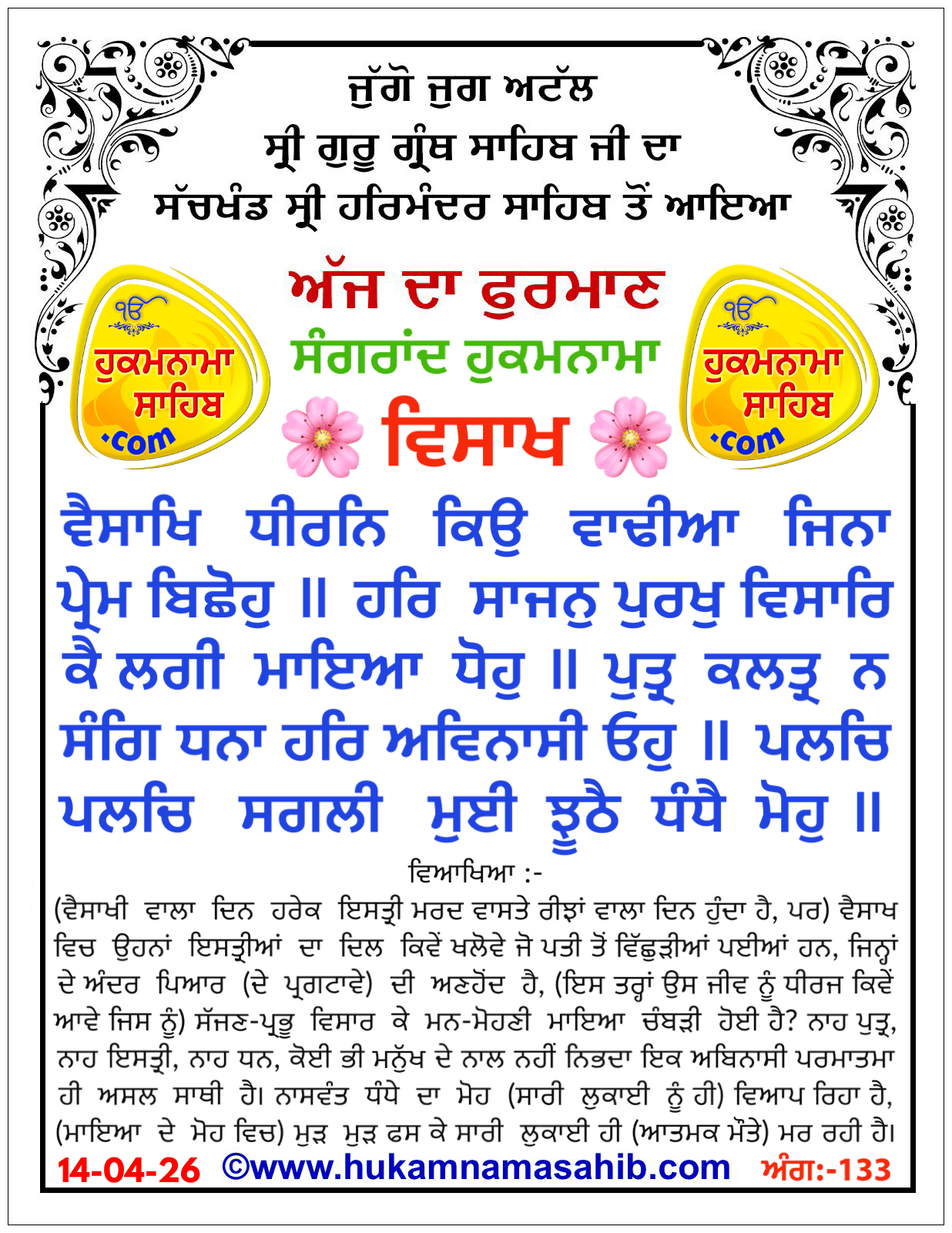 ਬਾਰਹ ਮਾਹਾ ਮਾਂਝ ਮਹਲਾ ੫ ਘਰੁ ੪ ੴ ਸਤਿਗੁਰ ਪ੍ਰਸਾਦਿ ॥ ਵੈਸਾਖਿ ਧੀਰਨਿ ਕਿਉ ਵਾਢੀਆ ਜਿਨਾ ਪ੍ਰੇਮ ਬਿਛੋਹੁ ॥ ਹਰਿ ਸਾਜਨੁ ਪੁਰਖੁ ਵਿਸਾਰਿ ਕੈ ਲਗੀ ਮਾਇਆ ਧੋਹੁ ॥ ਪੁਤ੍ਰ ਕਲਤ੍ਰ ਨ ਸੰਗਿ ਧਨਾ ਹਰਿ ਅਵਿਨਾਸੀ ਓਹੁ ॥ ਪਲਚਿ ਪਲਚਿ ਸਗਲੀ ਮੁਈ ਝੂਠੈ ਧੰਧੈ ਮੋਹੁ ॥ ਇਕਸੁ ਹਰਿ ਕੇ ਨਾਮ ਬਿਨੁ ਅਗੈ ਲਈਅਹਿ ਖੋਹਿ ॥ ਦਯੁ ਵਿਸਾਰਿ ਵਿਗੁਚਣਾ ਪ੍ਰਭ ਬਿਨੁ ਅਵਰੁ ਨ ਕੋਇ ॥ ਪ੍ਰੀਤਮ ਚਰਣੀ ਜੋ ਲਗੇ ਤਿਨ ਕੀ ਨਿਰਮਲ ਸੋਇ ॥ ਨਾਨਕ ਕੀ ਪ੍ਰਭ ਬੇਨਤੀ ਪ੍ਰਭ ਮਿਲਹੁ ਪਰਾਪਤਿ ਹੋਇ ॥ ਵੈਸਾਖੁ ਸੁਹਾਵਾ ਤਾਂ ਲਗੈ ਜਾ ਸੰਤੁ ਭੇਟੈ ਹਰਿ ਸੋਇ ॥੩॥
