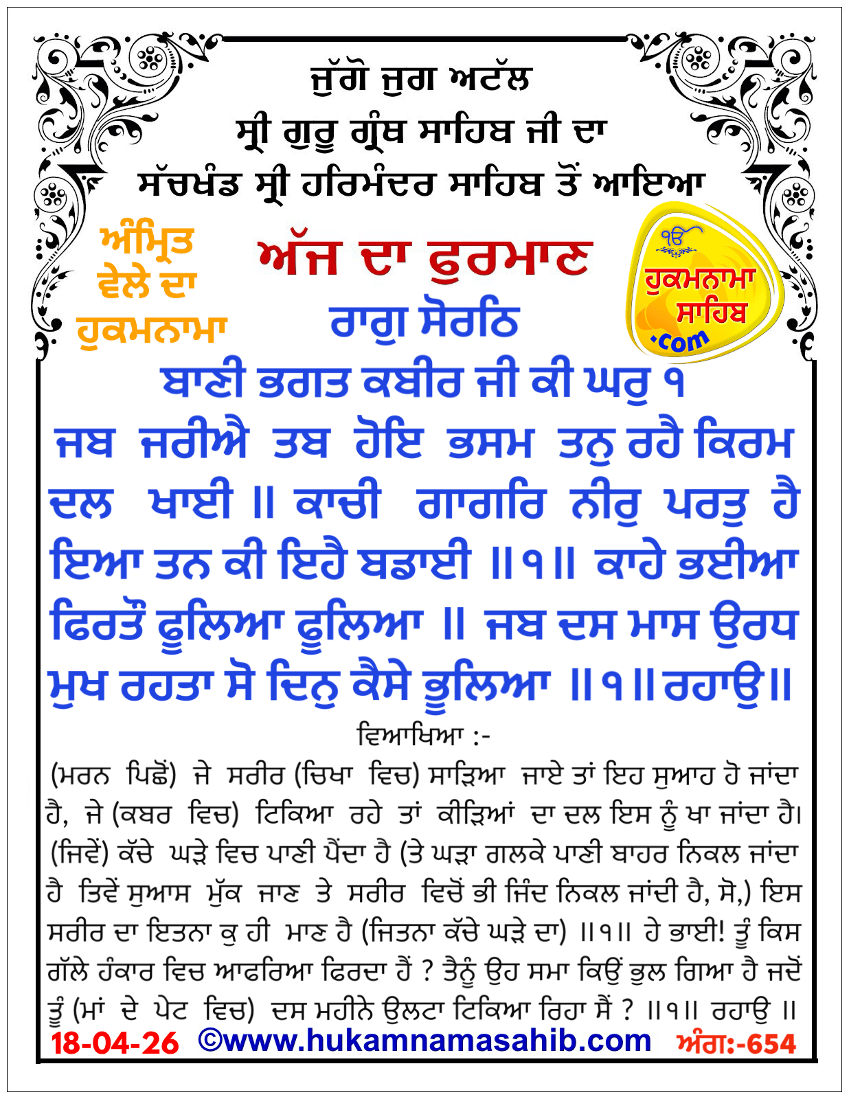 Meaning: Raag Sorath, The Word Of Devotee Kabeer Jee, First House: When the body is burnt, it turns to ashes; if it is not cremated, then it is eaten by armies of worms. The unbaked clay pitcher dissolves, when water is poured into it; this is also the nature of the body. ||1|| Why, O Siblings of Destiny, do you strut around, all puffed up with pride ? Have you forgotten those days, when you were hanging, face down, for ten months ? ||1|| Pause || Like the bee which collects honey, the fool eagerly gathers and collects wealth. At the time of death, they shout, “”Take him away, take him away! Why leave a ghost lying around ?””||2|| His wife accompanies him to the threshold, and his friends and companions beyond. All the people and relatives go as far as the cremation grounds, and then, the soul-swan goes on alone. ||3|| Says Kabeer Ji, listen, O mortal being: you have been seized by Death, and you have fallen into the deep, dark pit. You have entangled yourself in the false wealth of Maya, like the parrot caught in the trap. ||4||2||