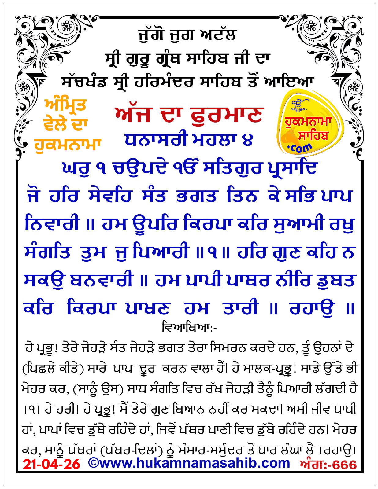Amrit Vele Da Hukamnama Sri Darbar Sahib, Amritsar, Date 21-04-2026 Ang 666