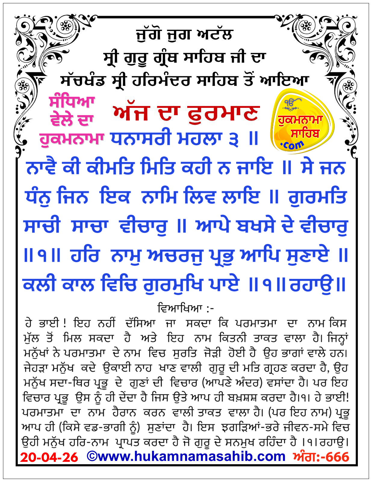 Meaning :- The value and worth of the Lord’s Name cannot be described. Blessed are those humble beings, who lovingly focus their minds on the Naam, the Name of the Lord. True are the Guru’s Teachings, and True is contemplative meditation. God Himself forgives, and bestows contemplative meditation. ||1|| The Lord’s Name is wonderful! God Himself imparts it. In the Dark Age of Kali Yuga, the Gurmukhs obtain it. ||1|| Pause || We are ignorant; ignorance fills our minds. We do all our deeds in ego. By Guru’s Grace, egotism is eradicated. Forgiving us, the Lord blends us with Himself. ||2|| Poisonous wealth gives rise to great arrogance. Drowning in egotism, no one is honored. Forsaking self-conceit, one finds lasting peace. Under Guru’s Instruction, he praises the True Lord. ||3|| The Creator Lord Himself fashions all. Without Him, there is no other at all. He alone is attached to Truth, whom the Lord Himself so attaches. O Nanak Ji, through the Naam, lasting peace is attained in the hereafter. ||4||8||