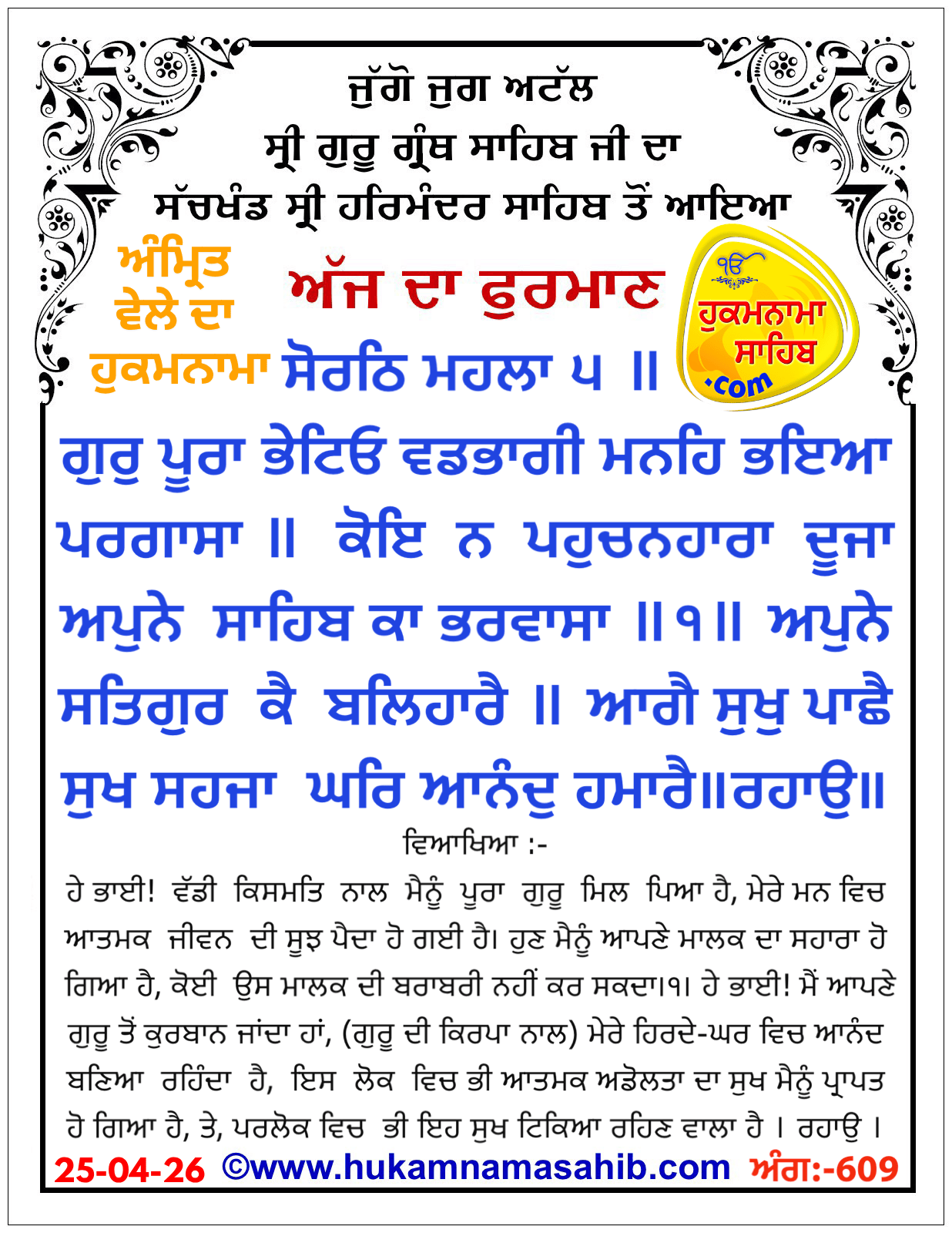 AMRIT VELE DA HUKAMNAMA SRI DARBAR SAHIB SRI AMRITSAR