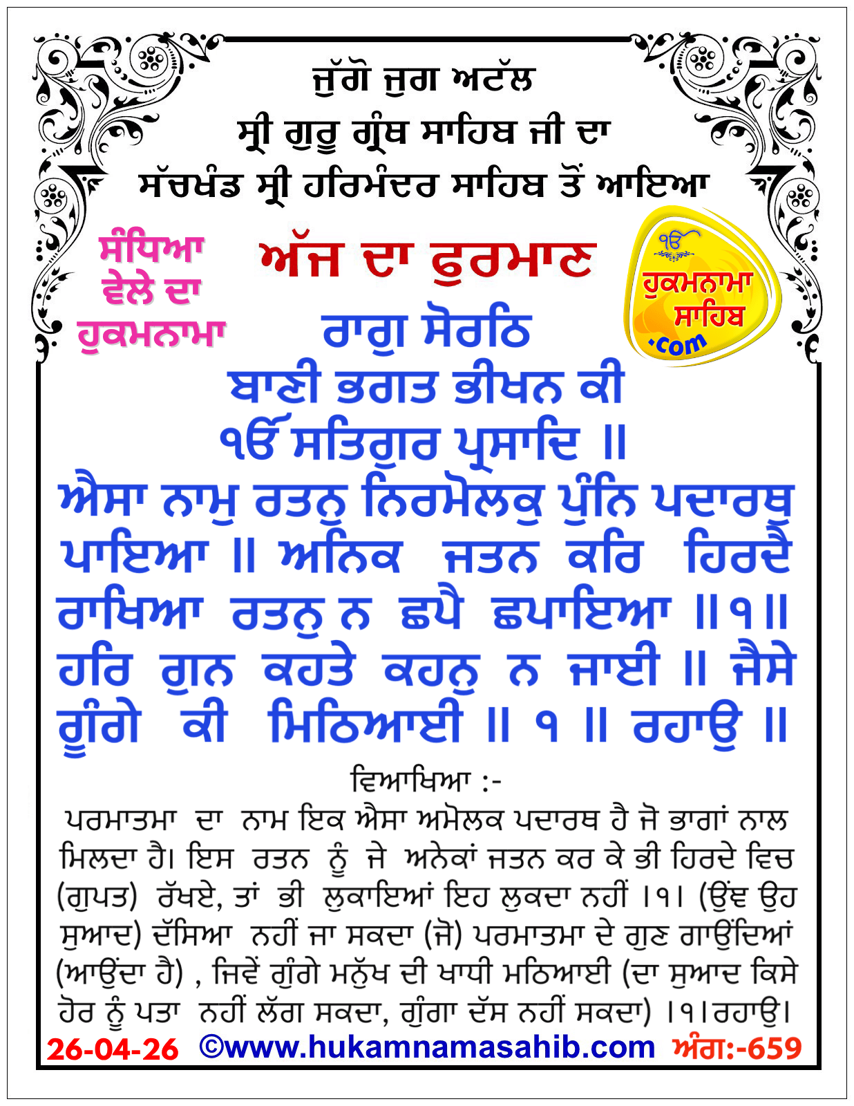 Sandhia Vele Da Hukamnama Sri Darbar Sahib, Amritsar, Date 26-04-2026 Ang 659